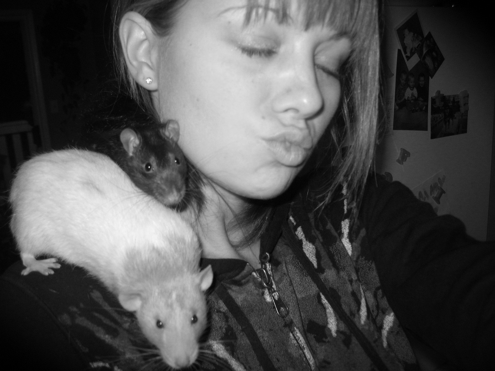 Iv'e always missed having them, so my boyfriend and I went to the Okanagan Rat Rescue and adopted two male rats.. ones a Blue faced Dumbo named Toopy 3 months old .. And the other is a Black and white male hooded Rattie 2.5 months old.... They are not brothers BUT they were cagemates, and do adore eachother...