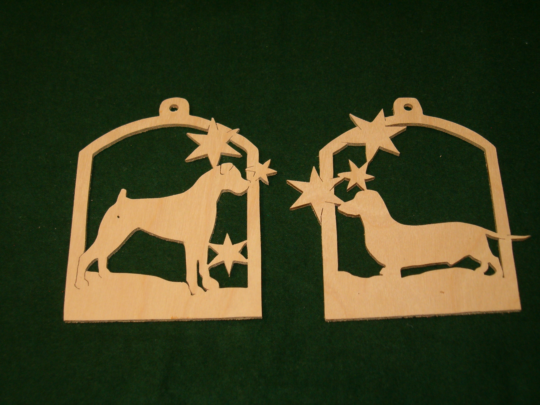 I am making Pet Angel Ornaments. The two outer ones are made of alder, the two inner are made of poplar. The wings are walnut. The cat is 2 1/2" tall while the dog is 2 3/4"tall. Asking $10.00 each with discounts on multiple ornaments. Also still doing puzzles and now portraits from photos in wood.