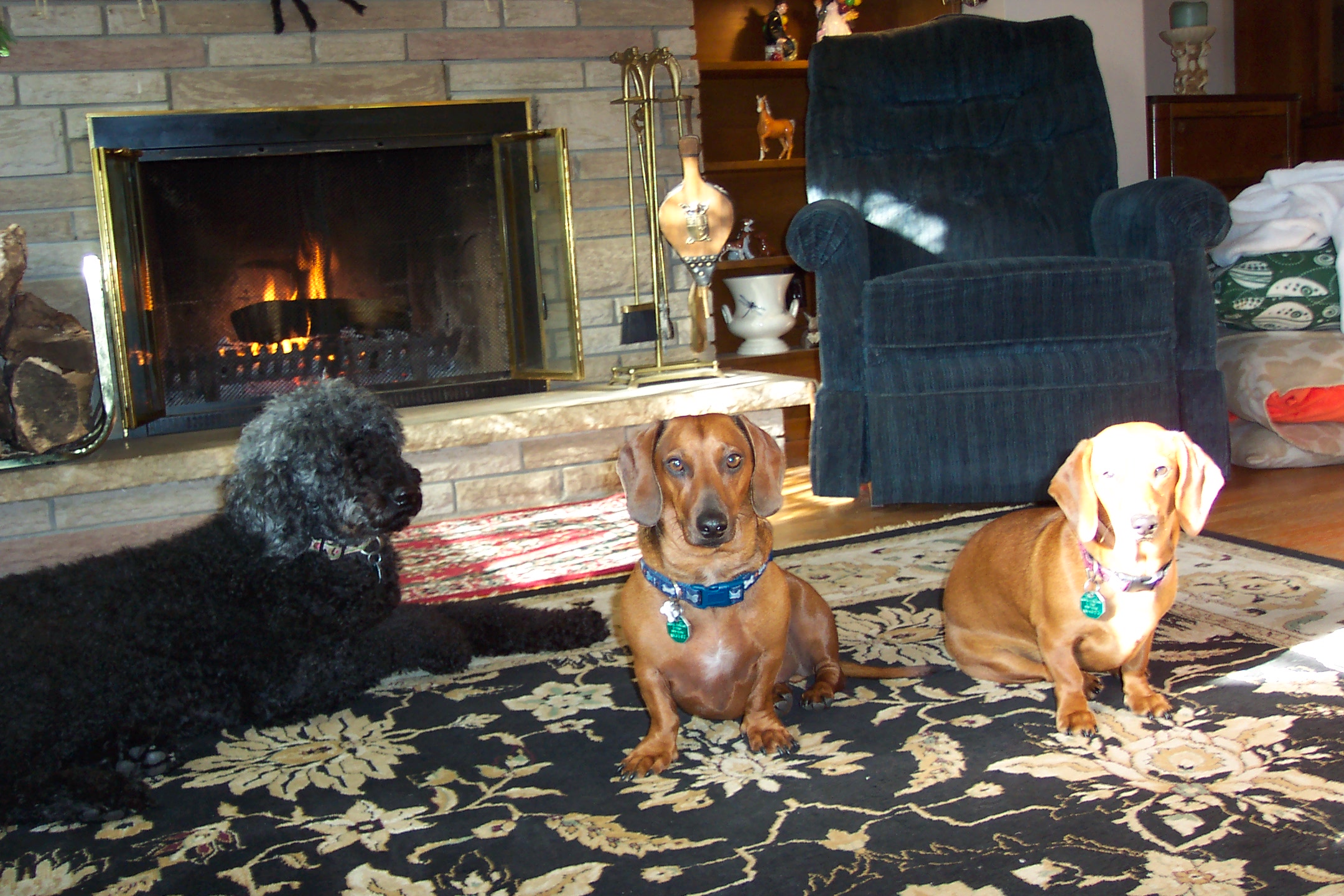 Oh My Goodness! What beautiful furbabies you have! I must say they look very cozy in front of the fireplace. A long time ago I had a doxie and she was very sweet; I'm sure your two are sweet too.
