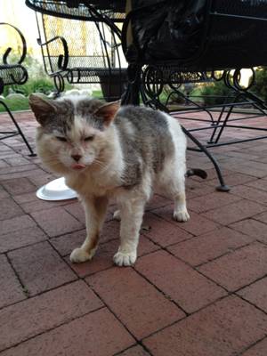 There is also an orange and white male with possible stomatitis/swollen mouth and a blind female cat with lupus that returned last night after being gone for 5 days, I was told she looks much worse than the male below. She has been feeding them outside for years. Now the family is moving to PA and the family does not have the funds for their care. They already have 8 cats and can't take on any more. No one in the neighborhood will feed them when she is gone.
