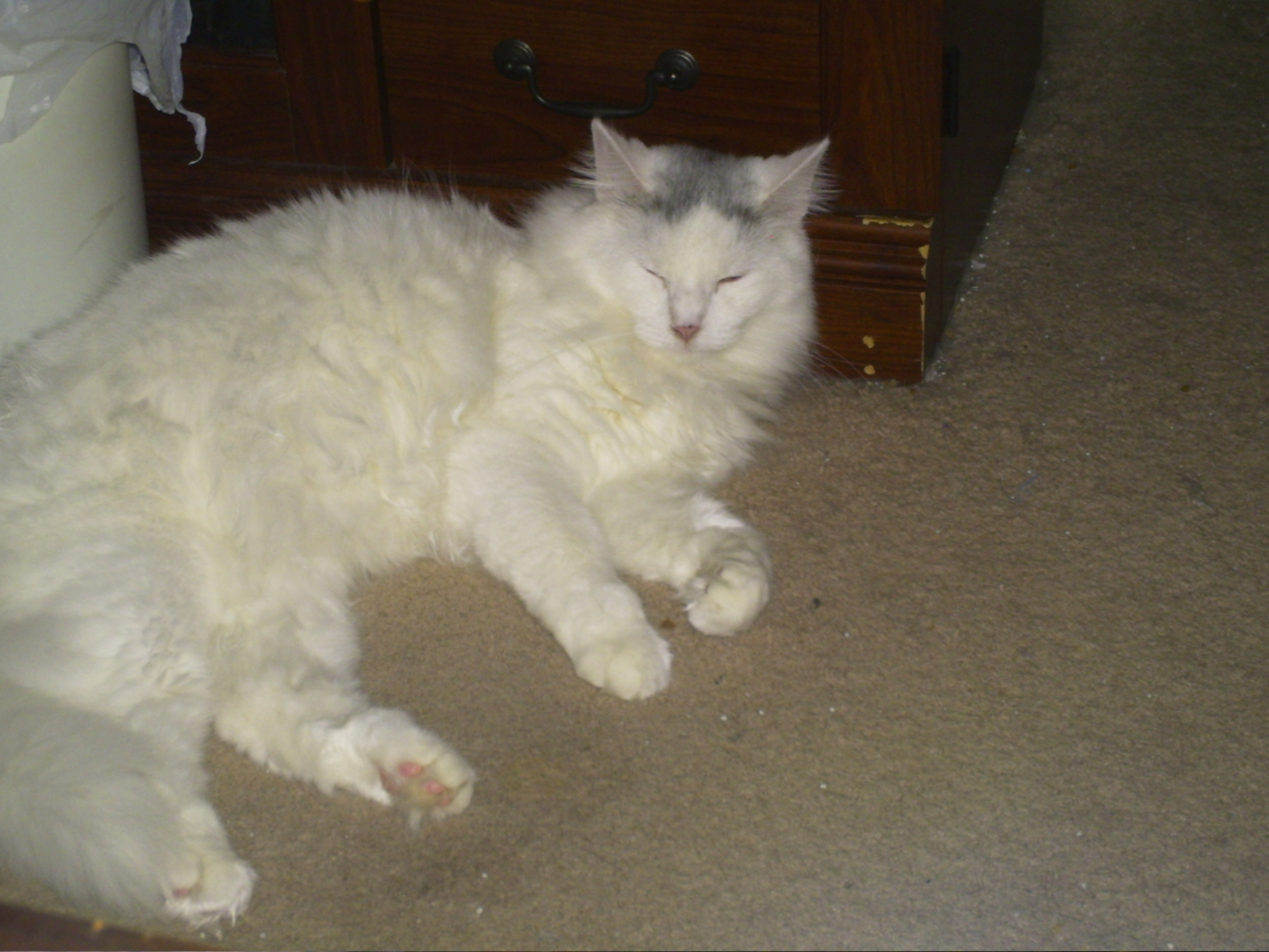 It was explained to me that there are 2 (possibly more) ways a cat can be white. 1) the absence of color......the cats with blue eyes and without hearing. The gene that programs the lack of pigment in the hair and eyes, also affect the hearing. and 2) the white gene spotting the cat with SO many spots of white that there is no dark color showing. These cats tend to have eye color OTHER than blue and can hear. Their hair has pigment and that pigment is white. And these are the cats who might show a bit of that other color.