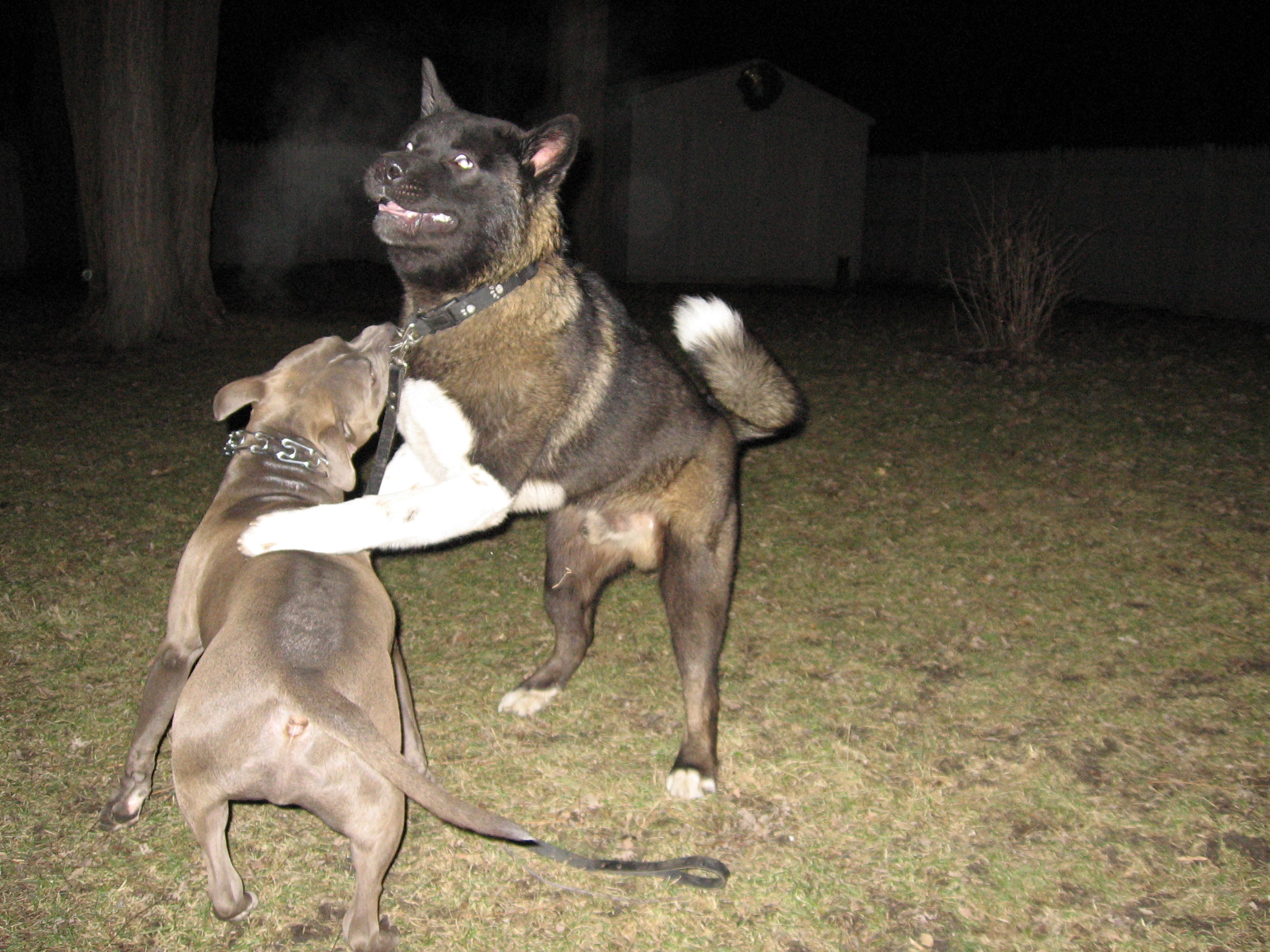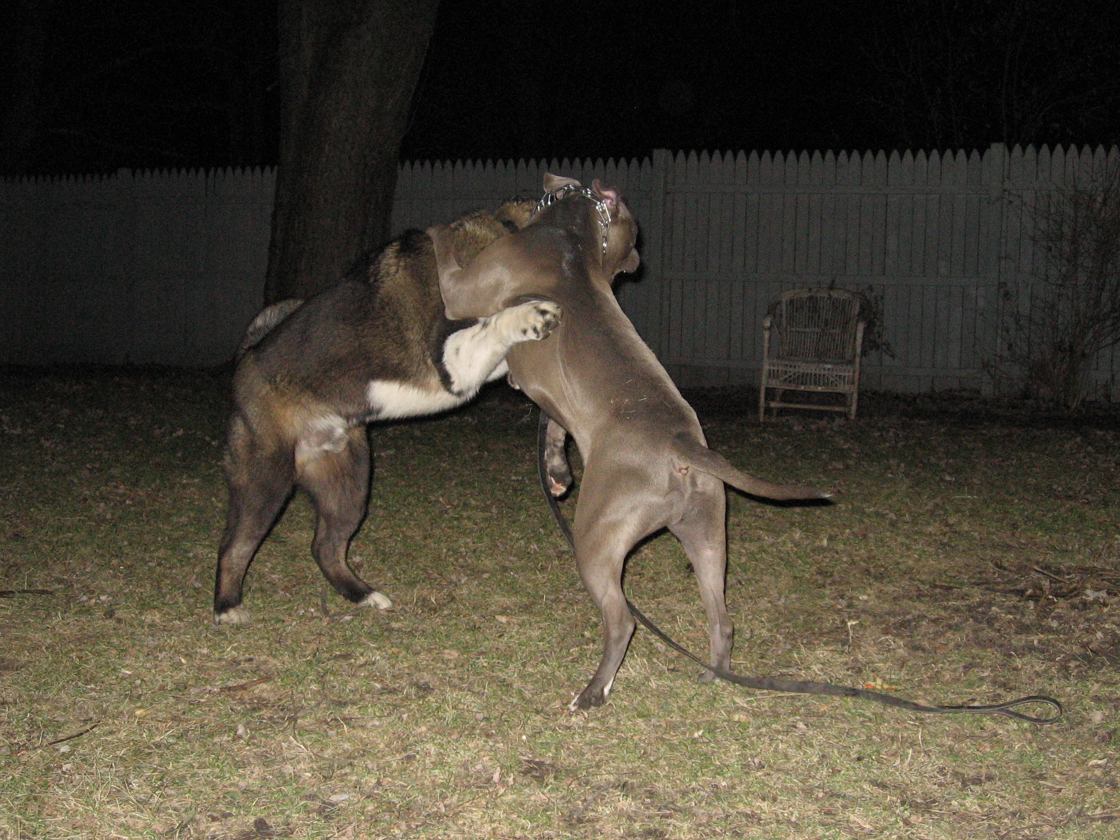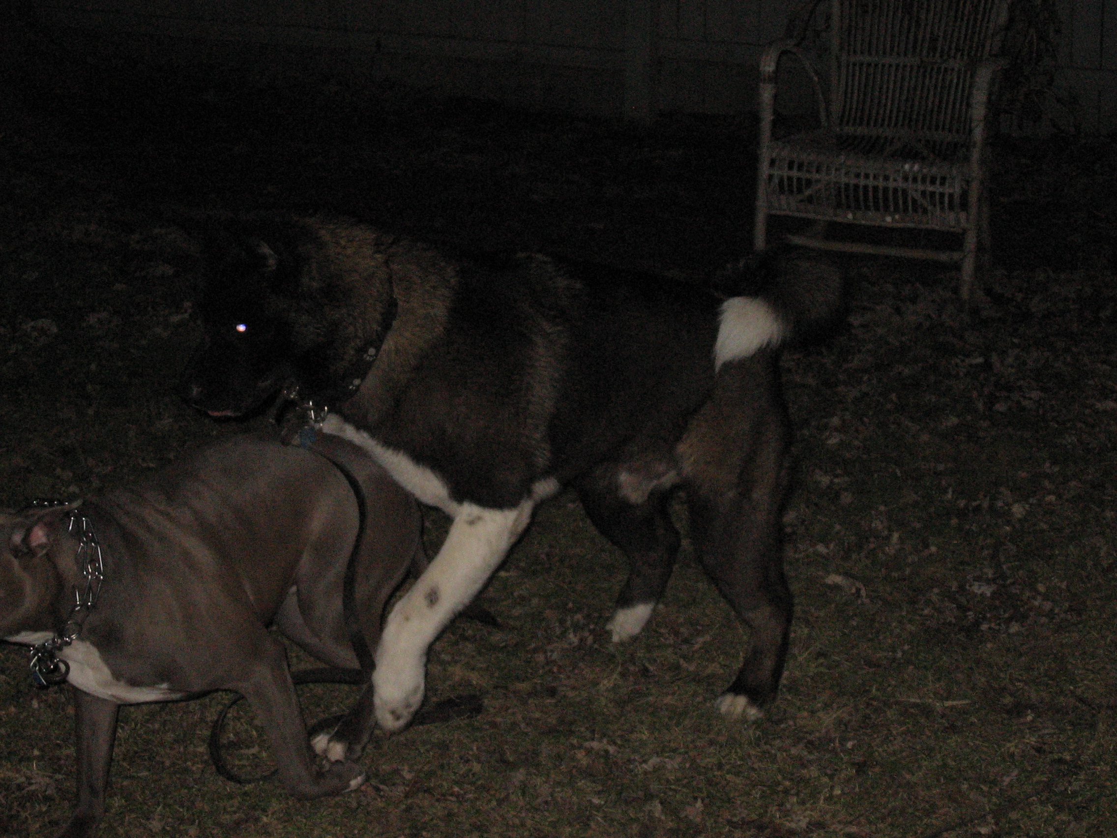 My friend Rob brought his 10 month old pitbull, Rex over to my house to play today with my 8 month old Akita, Zero.It was such a blast. At first they wrestled with each other for about an hour. We gave them lots and lots of water the whole time. Then I fed them both, separately. We tried to feed them together, but Zero snarled + growled so we separated them IMMEDIATELY. Rex was a little afraid of Zero for a few minutes after that, but then they were fine.