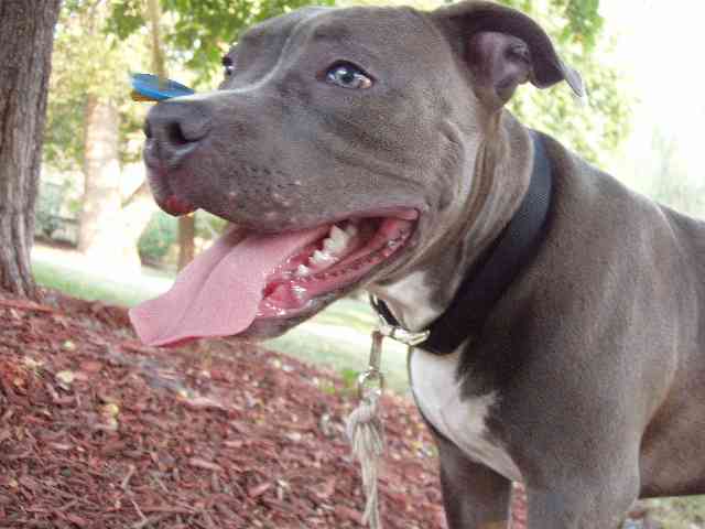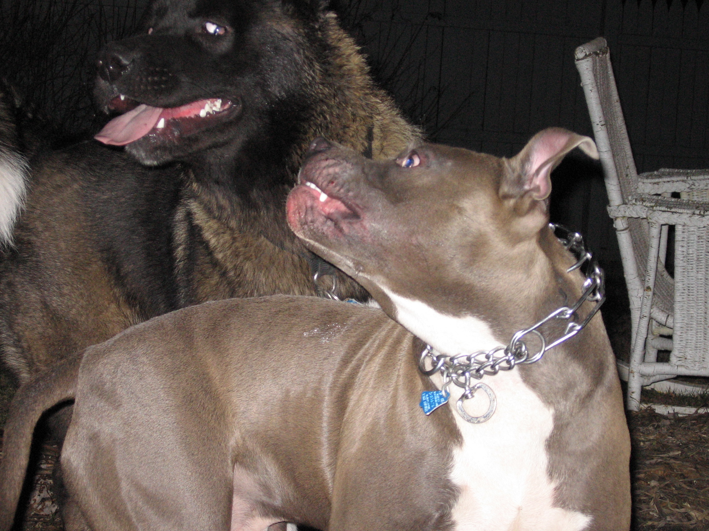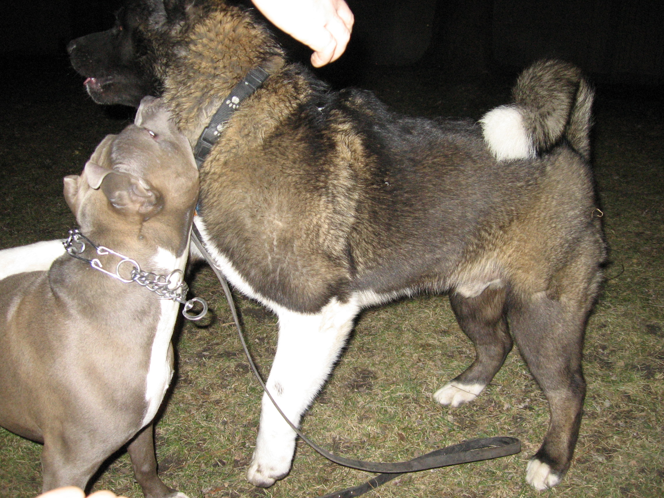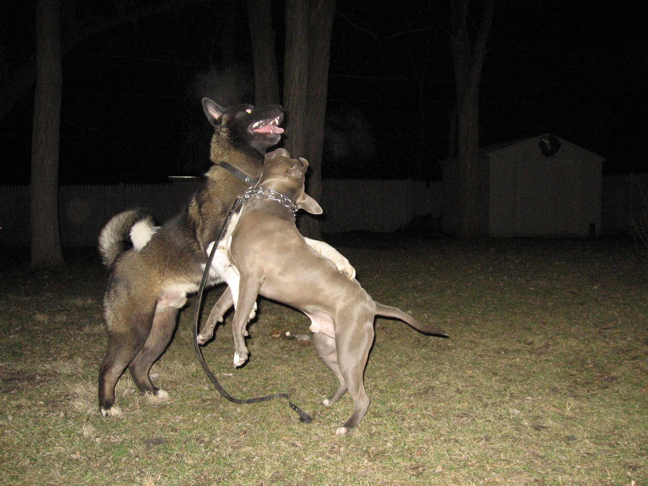 My friend Rob brought his 10 month old pitbull, Rex over to my house to play today with my 8 month old Akita, Zero.It was such a blast. At first they wrestled with each other for about an hour. We gave them lots and lots of water the whole time. Then I fed them both, separately. We tried to feed them together, but Zero snarled + growled so we separated them IMMEDIATELY. Rex was a little afraid of Zero for a few minutes after that, but then they were fine.