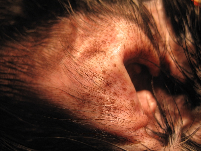 Josie has been holding one ear lower than the other, and shaking her head. I figured it's an ear infection, as she has a lot of them. I checked her ears to see how red they are, but they weren't at all. Instead, there are this little brown/red dots. They cover all the pink part of her ear, even the flappy part. They look almost like freckles. I had some ear wash left over from her last infection, and cleaned her ears...but, does anyone have any idea what it is, or if it's even serious? I'm wondering if it's something to call the vet over...