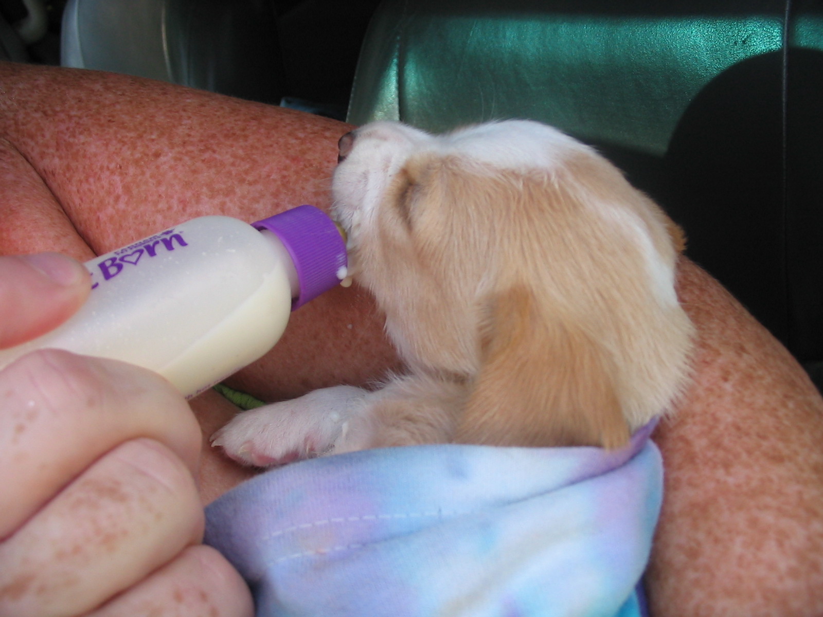 Hi all, I am brand new to this site, found it by browsing around. I have 2 dogs, 4 cats, 3 rats, and 2 hamsters. Oh yeah, 3 kids too... ha ha. Anyway, August 5th, my son's 10th birthday, we got a call from our next door 16 year old neighbor who said she had puppies for sale. Joey (my son) immediately threw all his other birthday wishes out the window and decided he wanted a puppy. So we went over. Cherokee had found 2 little puppies next to a dumpster when she heard whimpering and looke dunder a bush. They were crawling on their bellies and their eyes were not open. She picked them up and brought them home. Well, of course, one is now ours. The other was taken also. We were not sure if he would live at first. We went right down to Petco and got puppy formula and bottles and yet another bed bed.... lol.. and by jove he is flourishing! He took his first steps that night, and a few days later actually barked, and now he is eating solid food and lapping water, though I still give him the replacement colustrum I bought at Petco. I take him wherever I go, supermarkets, tag sales, not work yet, but everywhere, and he is quite content to play in his little bed with his toys when I plop the whole contraption into a Home Depot cart! I sometimes put him in a front holder, sometimes just his bed, sometimes a carry on kennel. He is the most adorable, beautiful little fellow. Joey named him Poochie and I think they were made for each other.... especially since he was found on Joey's birthday!! Can anyone tell me what they think his breeds might be? Based on research, etc., I am assuming Poochie is now about 5 - 6 weeks of age. I think when we got him two weeks ago he was around 3 weeks? Not sure.. anyway, have a go at his identification! I have heard everything from cocker spaniel to beagle to dachsund and maybe even lab. Thanks!! fulti I hope I upload these pictures right!
