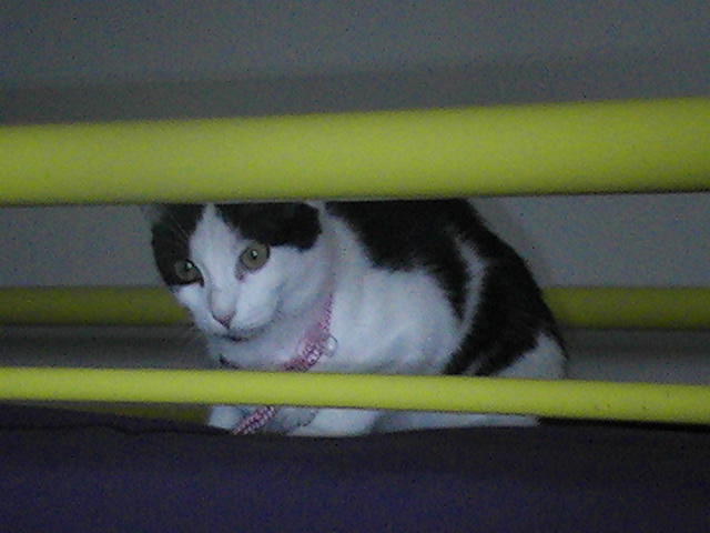 I took my three month old baby to the vet this morning for his first check up. Everything came out negative for harmful things. He does have ringworm on his nose though. But its okay. He was such big boy for the vet. Took his dewormer like a champ. Here is his picture . He is the grey and white one. The other is the queen of the house Oreo.As you can tell my little one is under the bed . Hes still mad about his shots.
