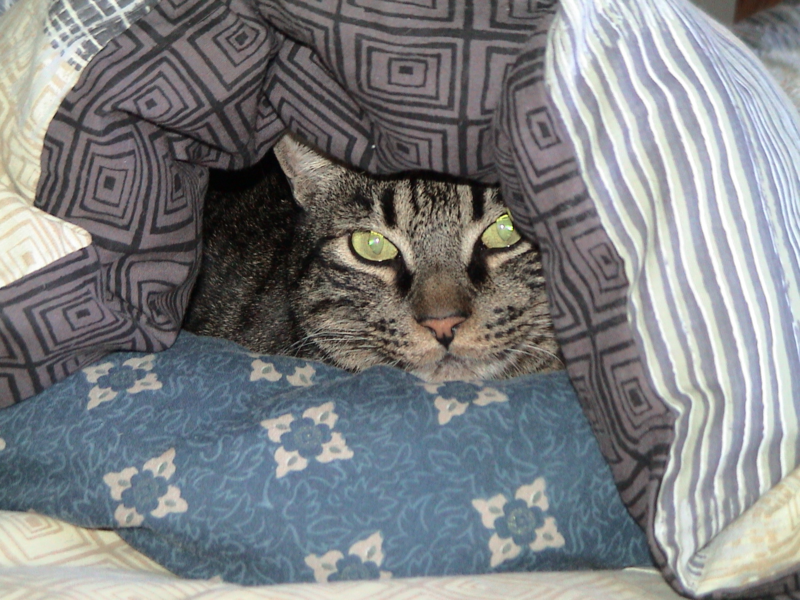Taz is my "fat cat" that I have had since 1995, so I put his age to be about 11 years. I guess he is a Tabby cat. I got him from a family that loved him as much as I do, but couldn't keep him due to the fact that two of the family members were allergic to him. He has endured MANY moves with me over the past 11 years and has been a trooper with getting use to new homes and roommates pets. Usually for the first month or so he would hide under the covers on the bed. (attached photo of this)