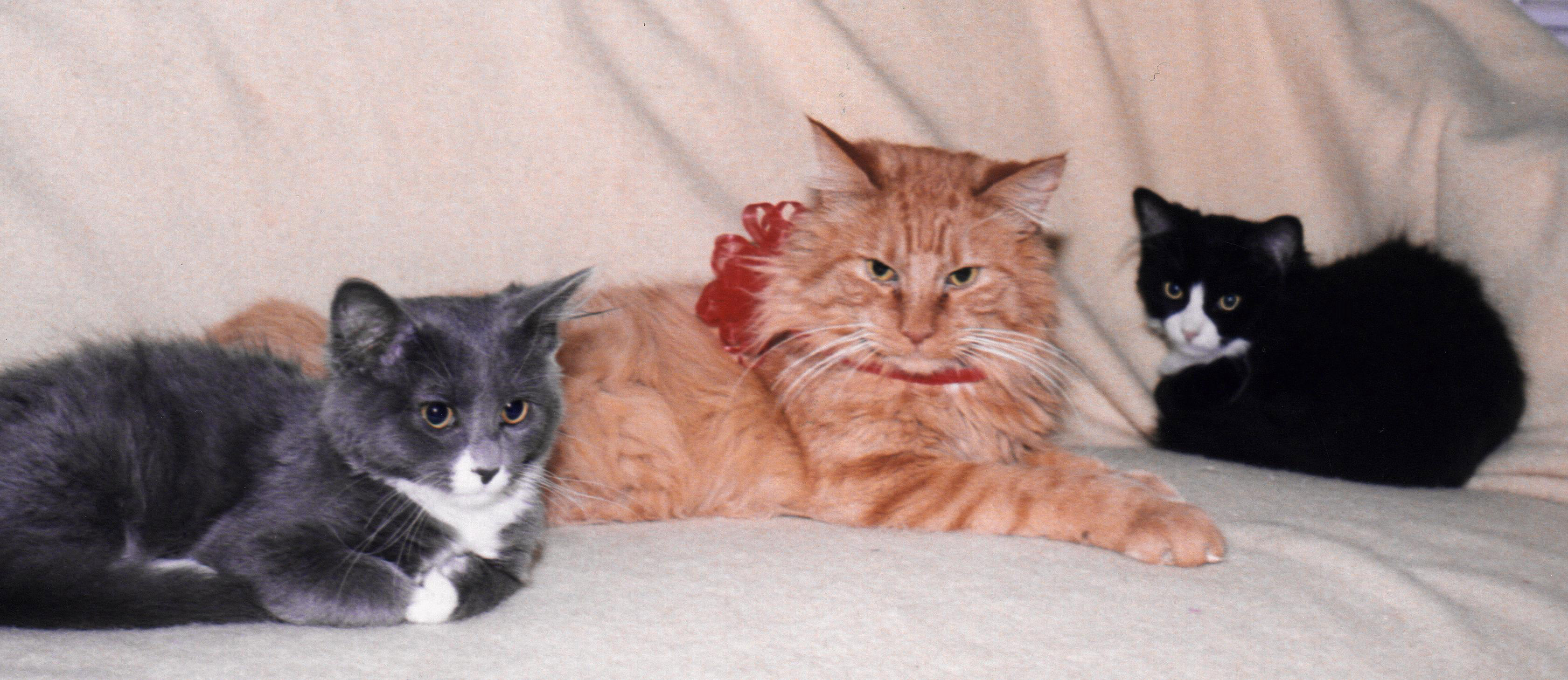 This is the pitiful result of my attempts to take a Christmas photo of my three cats. I tied a bow on Sassy and started in with the camera work. The cats were greatly annoyed by the camera flash, and all look thoroughly grouchy.