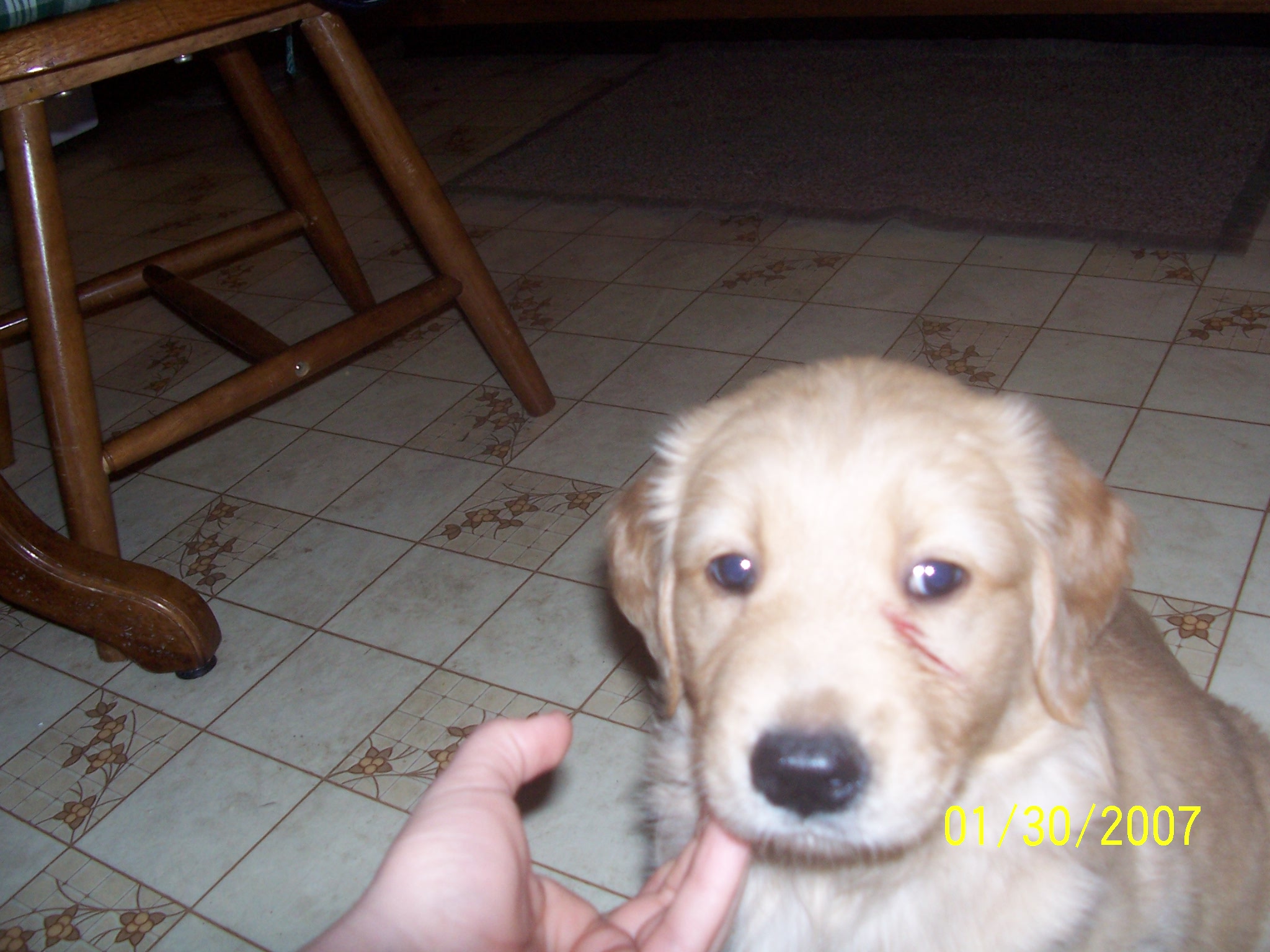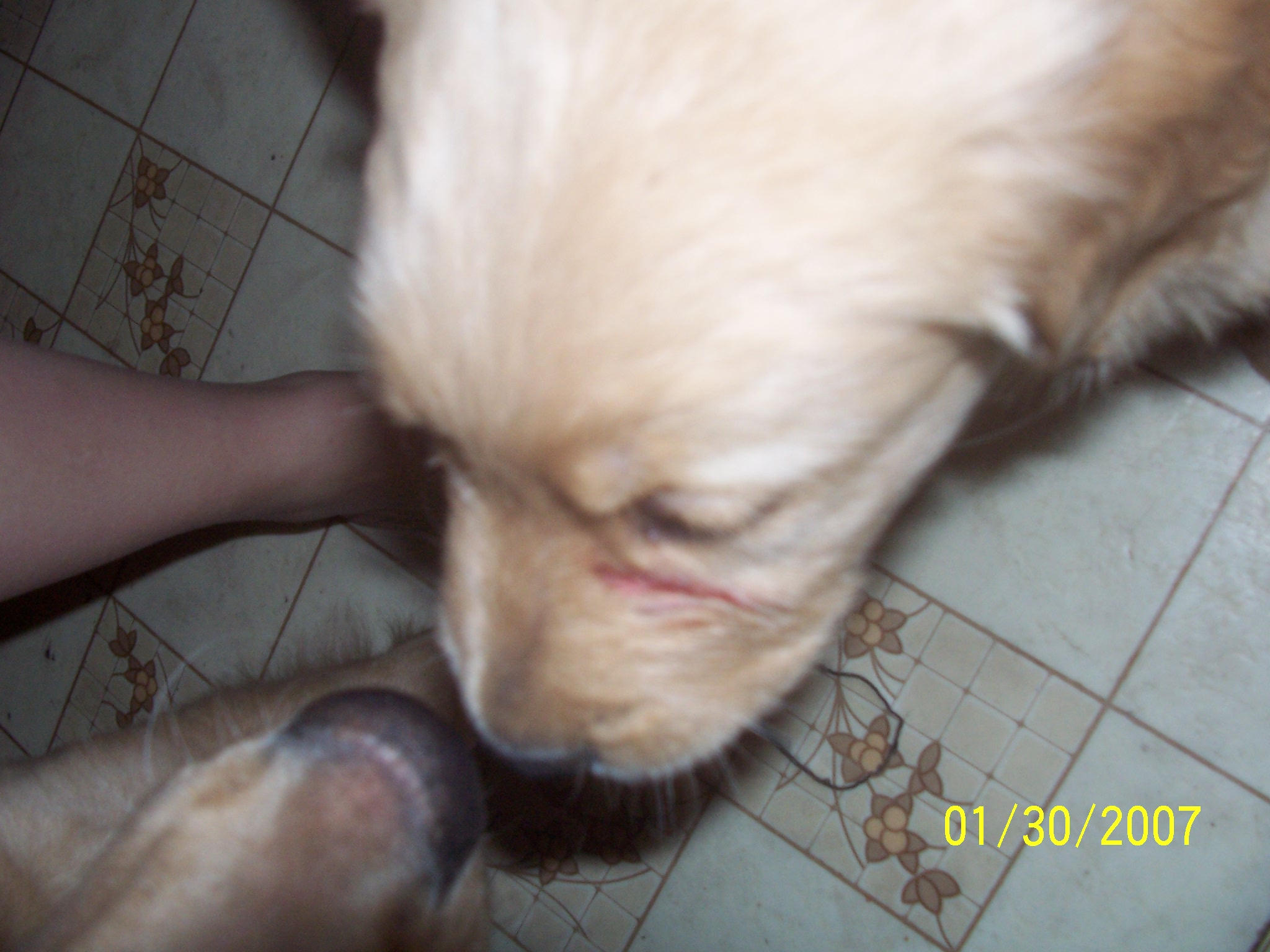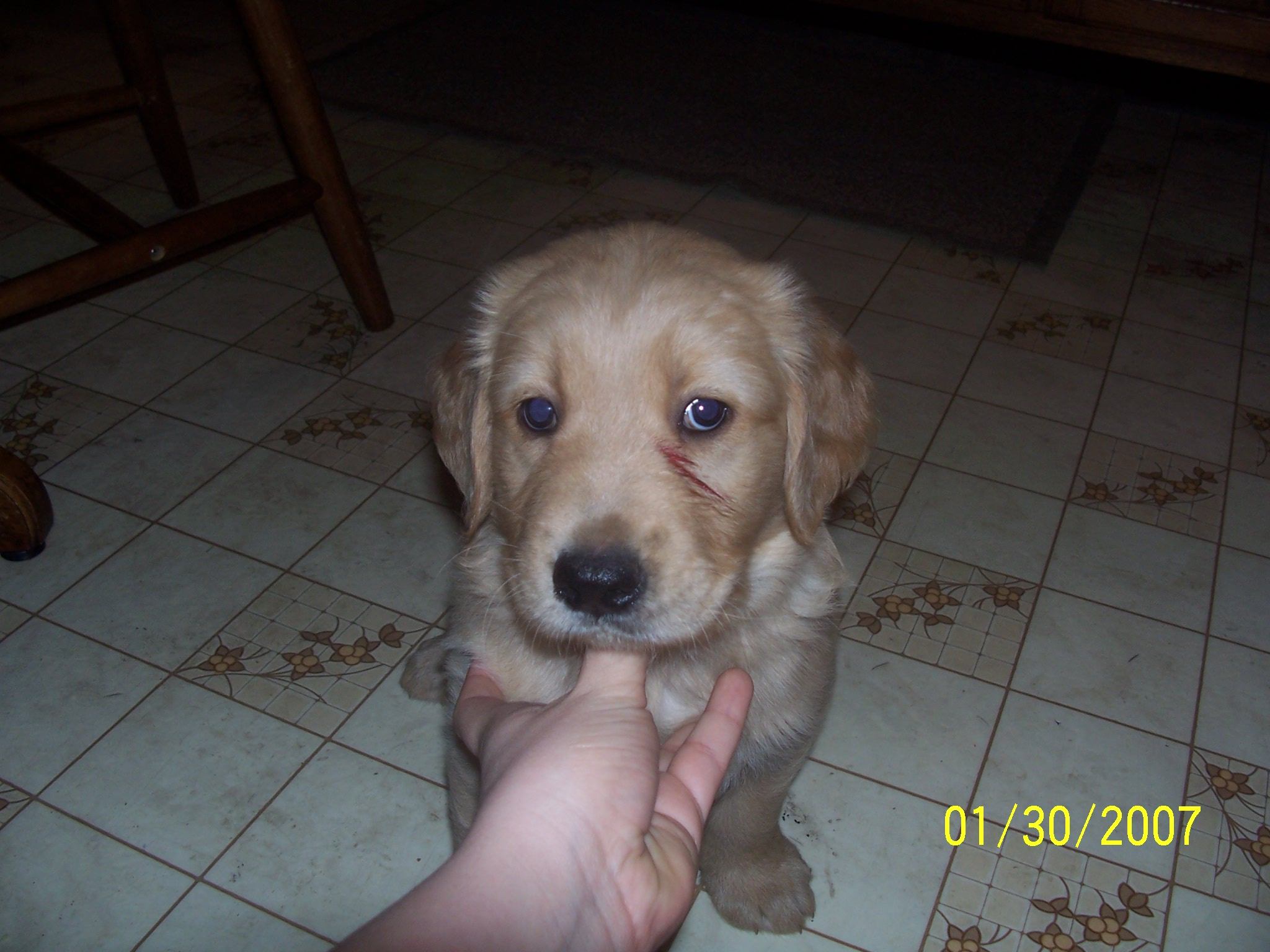 here is apic of the pup right after she bit him, we cleaned him up and cheacked to see if it was bad enough he had to be taken to the vet but it didnt seem to bad after it got cleaned and taken care of. I feel so bad for little Gus Gus, he is sleeping in my room tonight so if he seems to be in pain through the night I will be right there to check it all out.