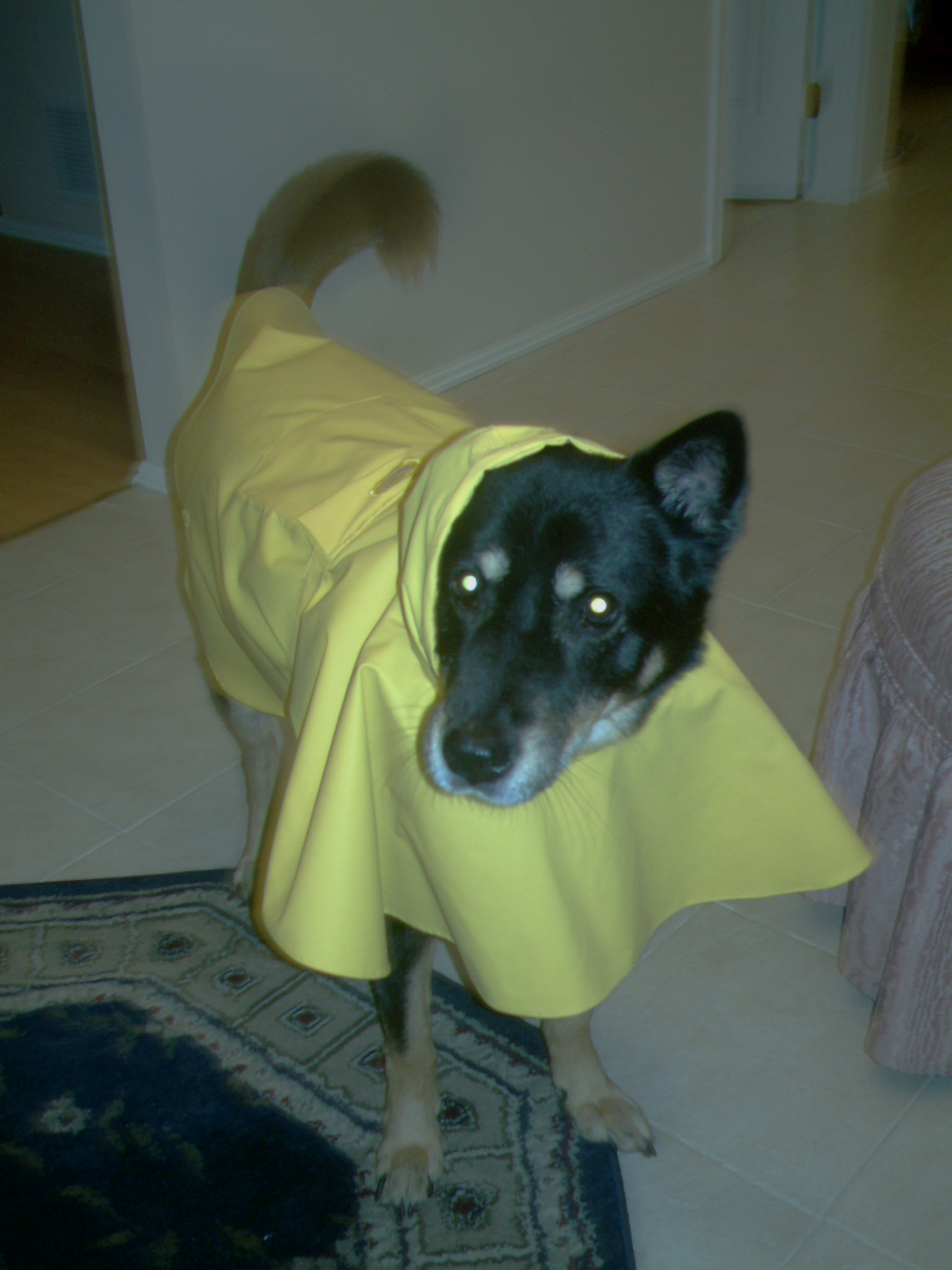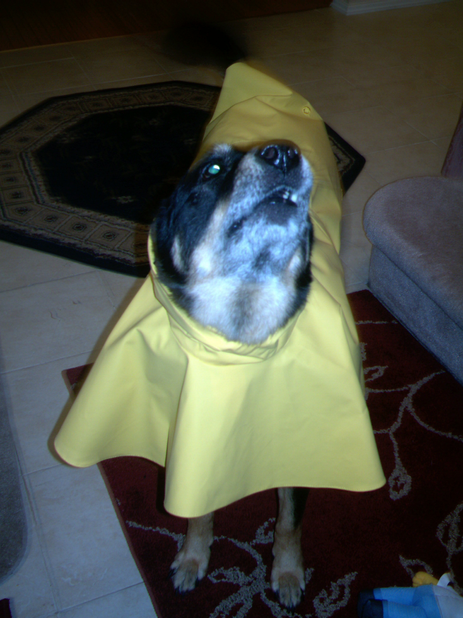 It was pouring rain last night and pretty much all of today. Of course Rusty had to go outside, so he went out in his raincoat.He still got so wet though because he stood there not wanting to go until my mom figured he didn't want to go with the coat on (afraid he'd pee on it lol). Here's two pictures,feeling lazy so there attached.