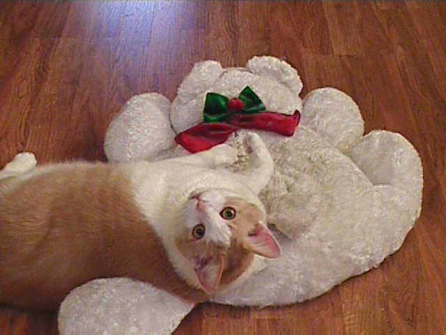 I guess if I have a heart cat it would be Zingo. He was my Kunan's best buddy and when we lost Kunan 2 years ago Zingo and I shared our grief...he is my baby. So here he is with HIS polar bear showing off our new hard wood flooring....and a close up....
