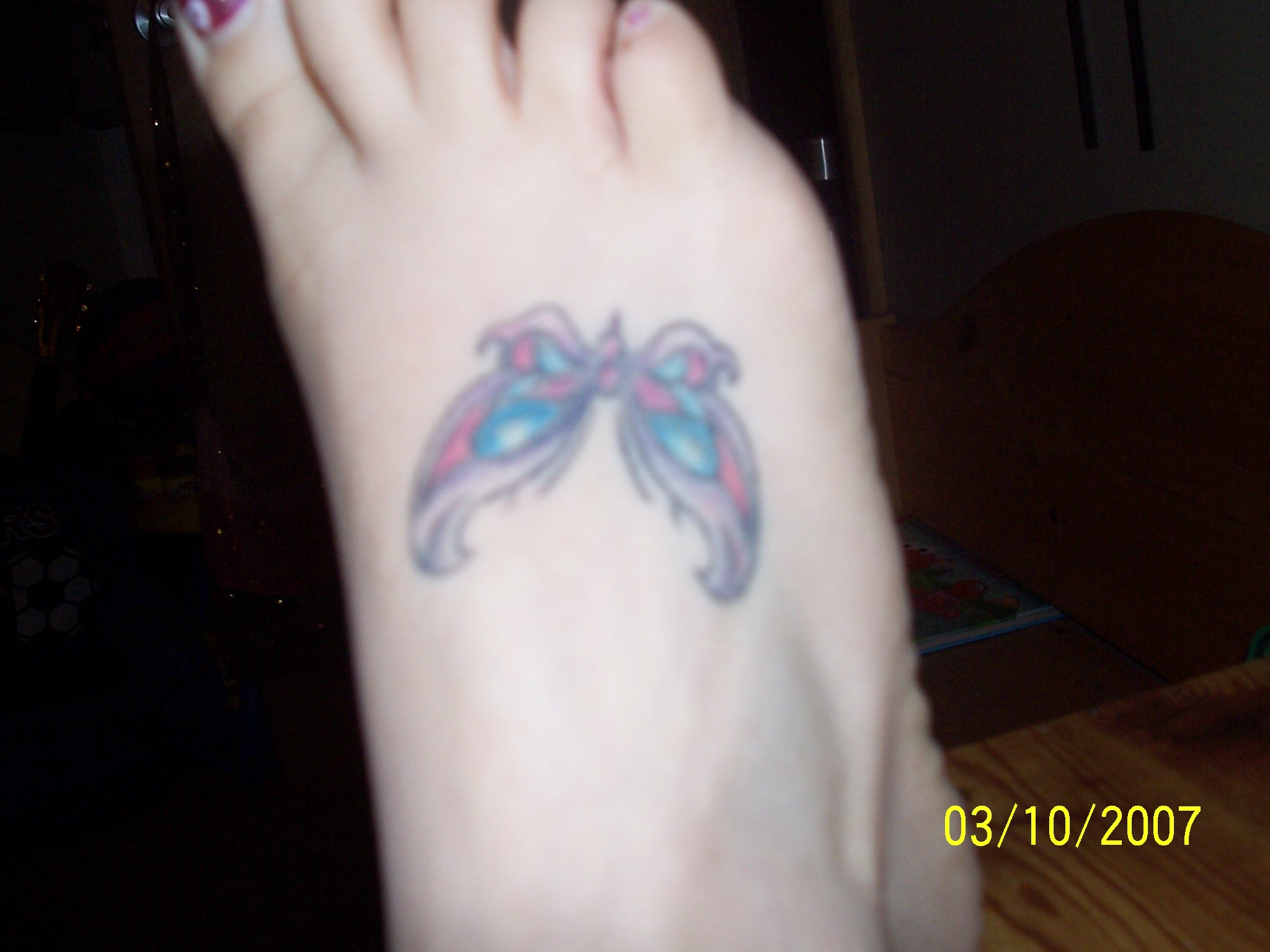 Here is the first one I got on my ankle...there is no meaning behind it, I just liked this particular butterfly and it was my first one...it's about 4 years old...