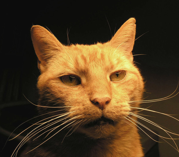 These are really good. It looks like the warmth of the lamp is slowly making him drowsy.That black background make his "orangeness" stand out all the more and shows off his handsome whiskers!