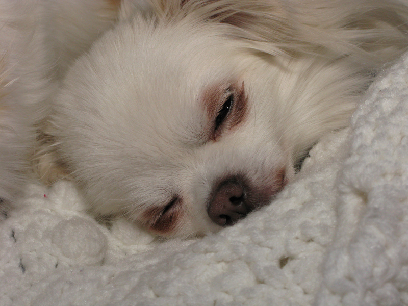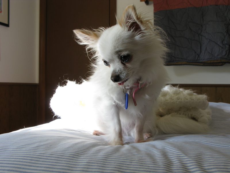 I first met Tinker the day before at the rescue organization annual alumni picnic. Tinker was originally rescused from the same puppymill as Rosy. Tinker was originally adopted by a college student in the Columbia MO area. After three months, the college student surrendered Tinker because she thought that Tinker was too hyper! Tinker hyper? I don't think so! Tinker just wanted attention and I don't think that the college student could give it to her. Today, Tinker is one spoiled rotten chi.