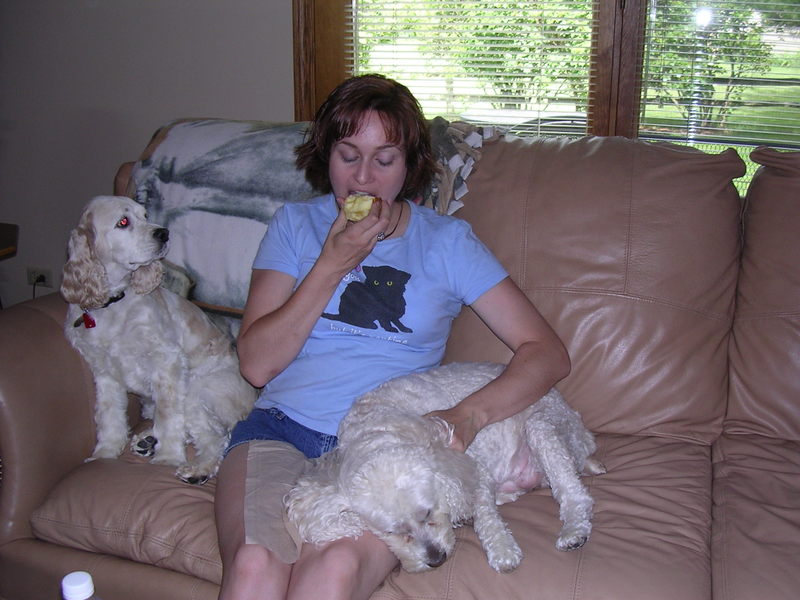 Oh, Oh, Oh! What a surprise this morning to see this mini Pet Talk meeting! I am guessing it was a spur of the minute thing. I can't imagine Rachel keeping such a secret without *spilling the beans.* Kimmy you look terrific, but who wouldn't be glowing in the company of my very favorite cocker and cockapoo in all the world.I am smiling at the way that Hannah is watching you eat that apple!