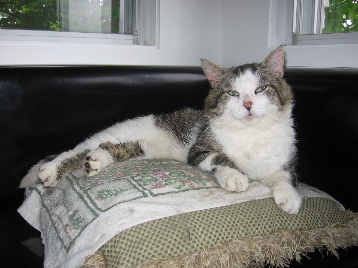 This white and striped tomcat is Pixie, aka Pix the Wix, aka Stinky Pix, aka Unfixed Pix. He is a stray cat who adopted us two years ago. He stinks, likes to sneeze in my face and comes up very beat up from his nightly escapade. We looooove him.