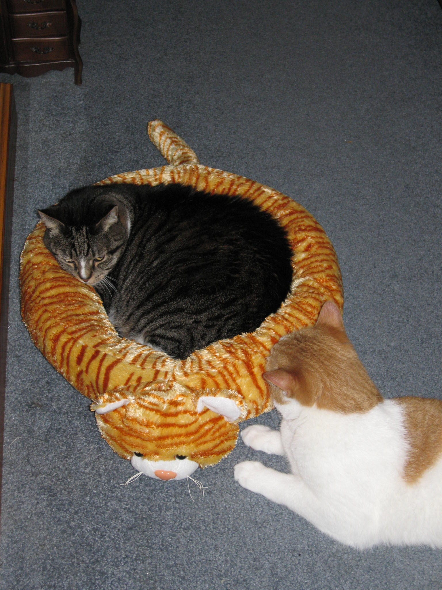 Then the next day my brother was going to a different town that had a Walgreen's. I had showed him pictures of Morgan in the bed that I had taken with my phone and asked him if he could check over there for the gray striped one. I thought that it would be good for Aroara because she is gray with stripes. He called me about half an hour later saying that they had so many options. They had the gray one and 2 different leopard ones and a light yellow striped one, which now that I'm thinking about it, that is probably what was originally posted in this thread. They also had the tiger one that Morgan already had. It was at this point that I realized that Morgan's was different than what was posted here. I was at a loss as to what to tell him. I already have 3 cat beds here for Morgan and Aroara. But I had him get the gray one and one of the leopard ones, since they are my favorite! Here are some pictures of those. As you can see, one of Morgan's other beds is there next to him. He hasn't used it since the new ones have arrived.
