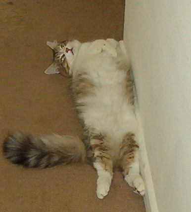We have a 2 yr old by the name of Junior P Tuna who gets wild at times. He bites and scratches himself frantically. The sides of his neck are raw; he has scabs on his back. He’s managed to lick/bite fur off the base of his tail. It’s not fleas, we do the Revolution and I’ve checked. Not only the biting and scratching, but when we’re sitting down he will go from me to my room mate back and forth. Some times he acts like something’s after him, running back and forth, twitching as though something’s crawling on him. He will do the same thing the same way over and over in a pattern until he tires himself out, then he sleeps like a little angel.