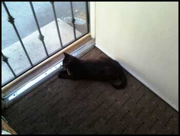 My cats love the sun! Buddy lays between the sliding door and the vertical blinds.