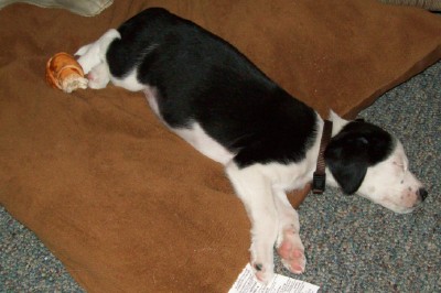 Good for your son! You should be proud!! The pup is adorable!!! I love it when puppies are sleeping on their beds with their heads on the floor....why do they do that? I know Boomer did.....He's a doll!!! Keep sending pictures this way!