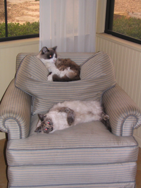 I should tell you a little about them. Fiona, the female, is mostly white with a little gray and beautiful blue eyes. She has the cutest face. She is very loving and loves to sit on your lap. Whoever is sitting on the sofa can be sure to have Fiona on their lap in minutes. She was born with a growth in her bladder. After many treatments with different antibiotics, the growth disappeared. However, this left her with a very sensitive bladder. She can only eat canned CD cat foot. She can't even eat the dry CD, otherwise she gets a bladder infection. I feed the male cat the same thing so that there is no other food around for her to eat. Moko, the malecat, is white and gray. He is very exotic looking with the same blue eyes. He has never had any health problems and can eat anything. Being the boy, he likes to play a little rough sometimes. Although he is very loving also, he is a little more independent. When you do start petting him though, sometimes he will bite when you stop. He never breaks the skin...it's just a little bite to tell you he wants more. He spends a lot of his time cleaning himself and Fiona. They both have long hair, so sometimes he gets big fur balls. They are both de-clawed in the front so they can only be indoor cats.