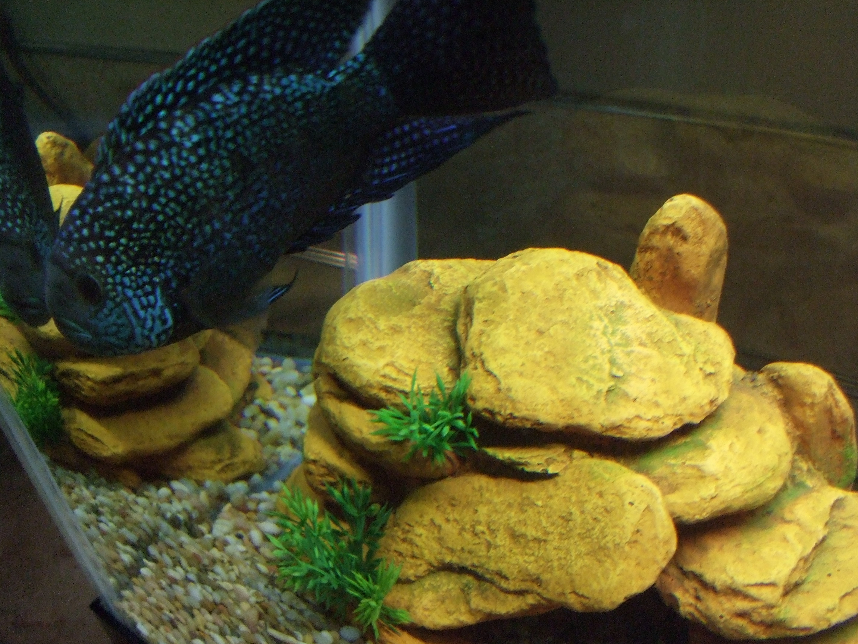 Here are pictures of the cichlid and pleco that were dumped off on my door step. I have no idea what type of cichlid this is. I have searched everywhere online to try to find a picture of one that looks like her, if it is indeed a female. I need to know how to care for her. We just transitioned her and the pleco into a 20 gallon tall tank. We have a 65 we will be putting them in once I get everything moved from my boyfriends over here. Yes, I still need to add more gravel, put a background up and add her rocks. Just waiting for my bf to bring them over. I love love love fish, but I was absolutely not prepared for these guys to be left at my house. I need to know what to put in the tank. I read that cichlids really like places to hide, and like to have rocks in their tanks so we will be adding those. Right now I just threw in what I had laying around, so they had at least something. Heck, I don't even know if rocks are exceptable because I don't know what she is. So I am attaching photos of her in hopes that someone may be able to help me.
