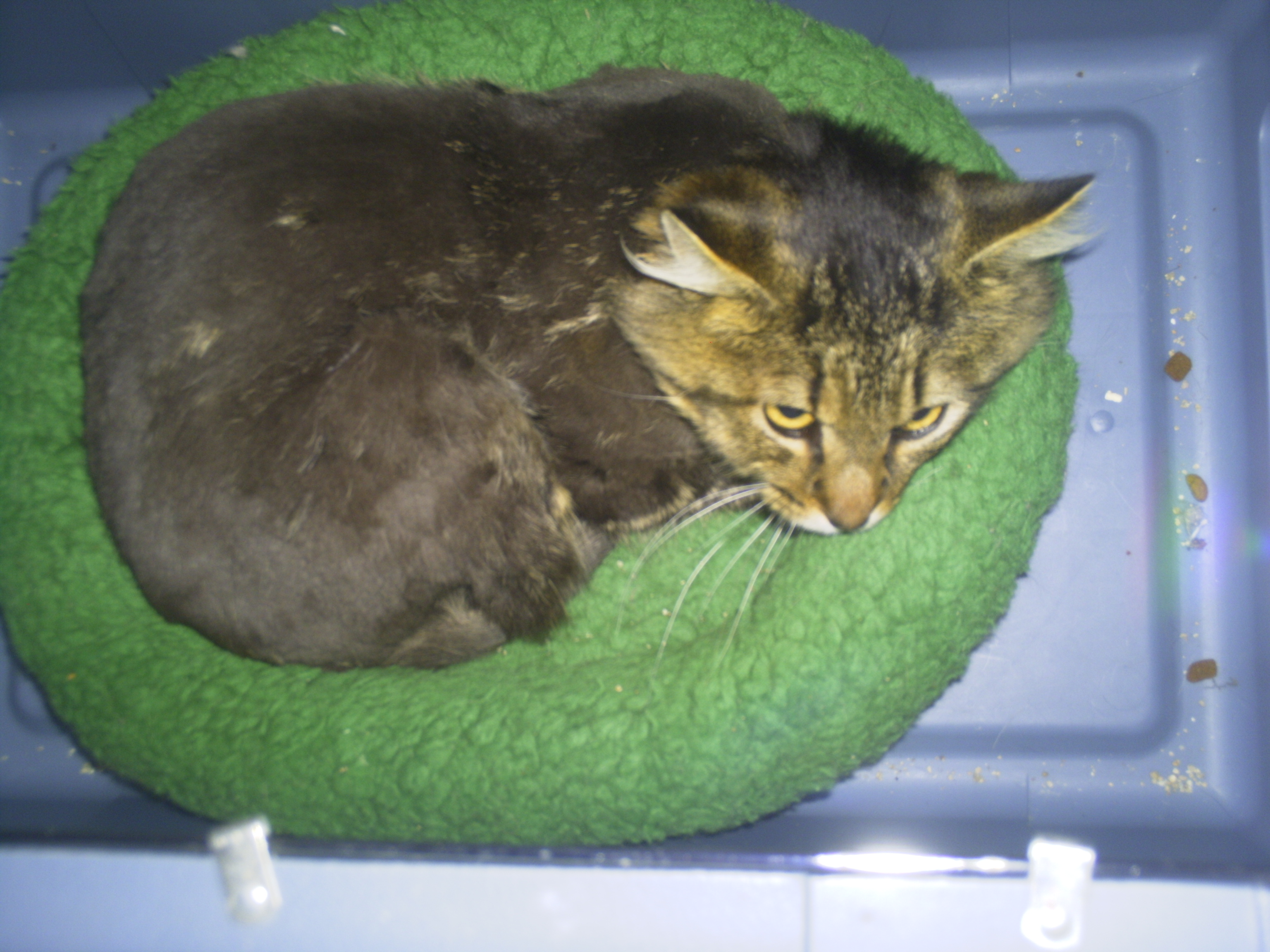 For now though, I'm attaching pictures of when I first trapped him, then when he was shaved, and the progress of his hair growing back.
