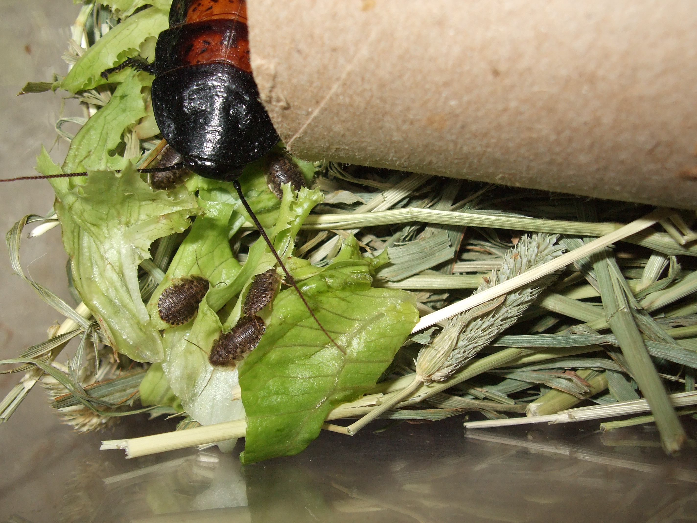 The first picture is not of the mother, but one of my hissing cockroaches with the babies. They eat pretty much anything, which is good for leftovers lol. So they're pretty fat and healthy before they get fed...or they will be any way. The babies have grown considerably since this photo was taken, which was about a week ago. The second picture is of the mom. The babies look just like her. I think they resemble rollie pollies.
