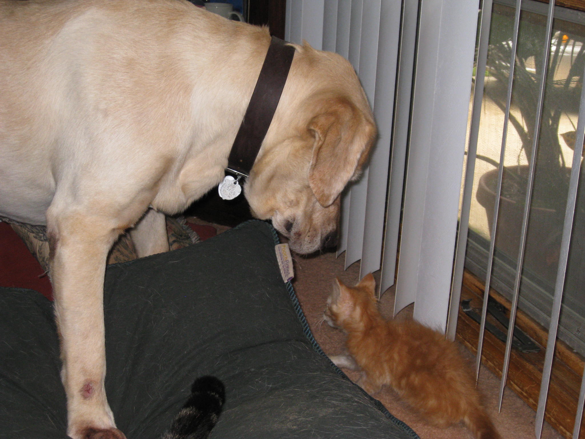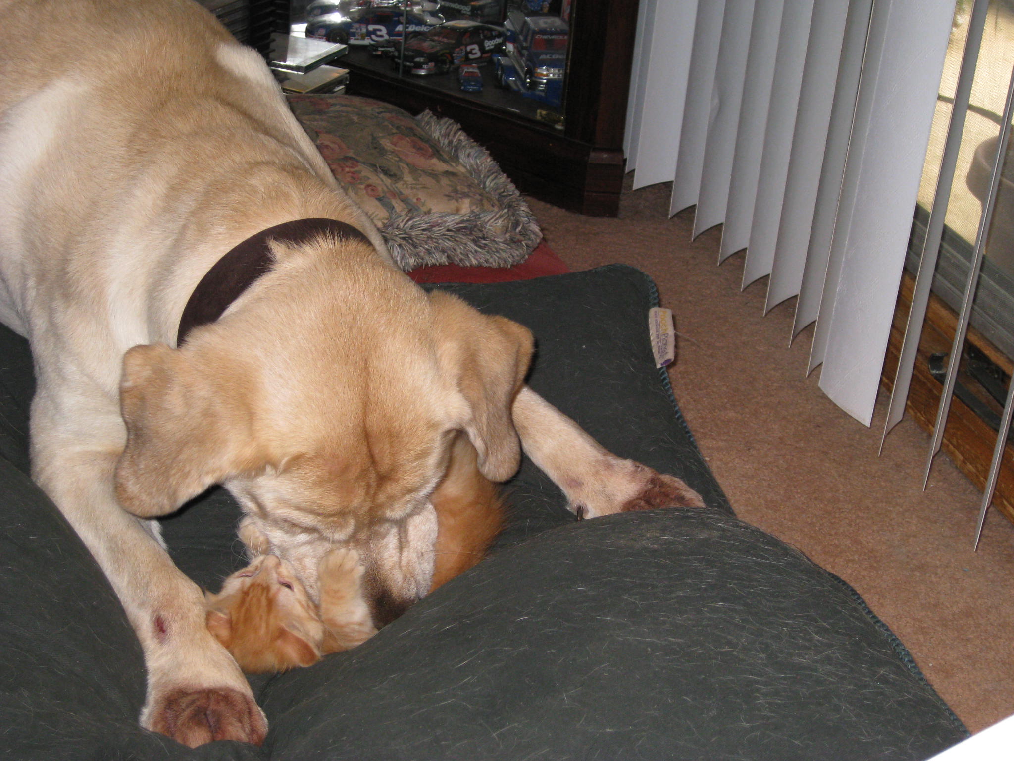 This is a two part post. One asking for prayers for my lab, Buckley. I have posted on Dog of the day, but usually I am here on the cat side. Short version of Buckley's story is that he was attacked by one of our other dogs and had horrific injuries especially to his chest. His chest became very necrotic and he has lost the vast majority of his chest. Our vet attempted Tuesday to reconnect some of his chest, but due to his injuries and his excessive skin not in the right location, she was limited in what she can do. She told me today that she can do no more and will refer him to a vetinary teaching school to see if there is anything that can be done, but is not very confident as the area than would need skin grafting is way to large. We already lost our other dog because of this and don't want to loose Buckley also. If you would please pray for him that if they can do something we can afford it (it has already stretched our finances as he has been in the vet for almost a month and the teaching hospital would be very high). The second part of the post is showing you Jasmine, my orange rescue from my colony. Look what this skinny runt grew into. Sorry it is not the best picture but I wanted show her along with Buckley. Last year I did up dates, and Buckley decided he was her appointed guardian and still is. Enjoy those pictures and thanks guys for being there. Momtomany of the Dunn gang. If you want to understand Buckley's situation better, it is under Dog general marked with Update on Buckley.