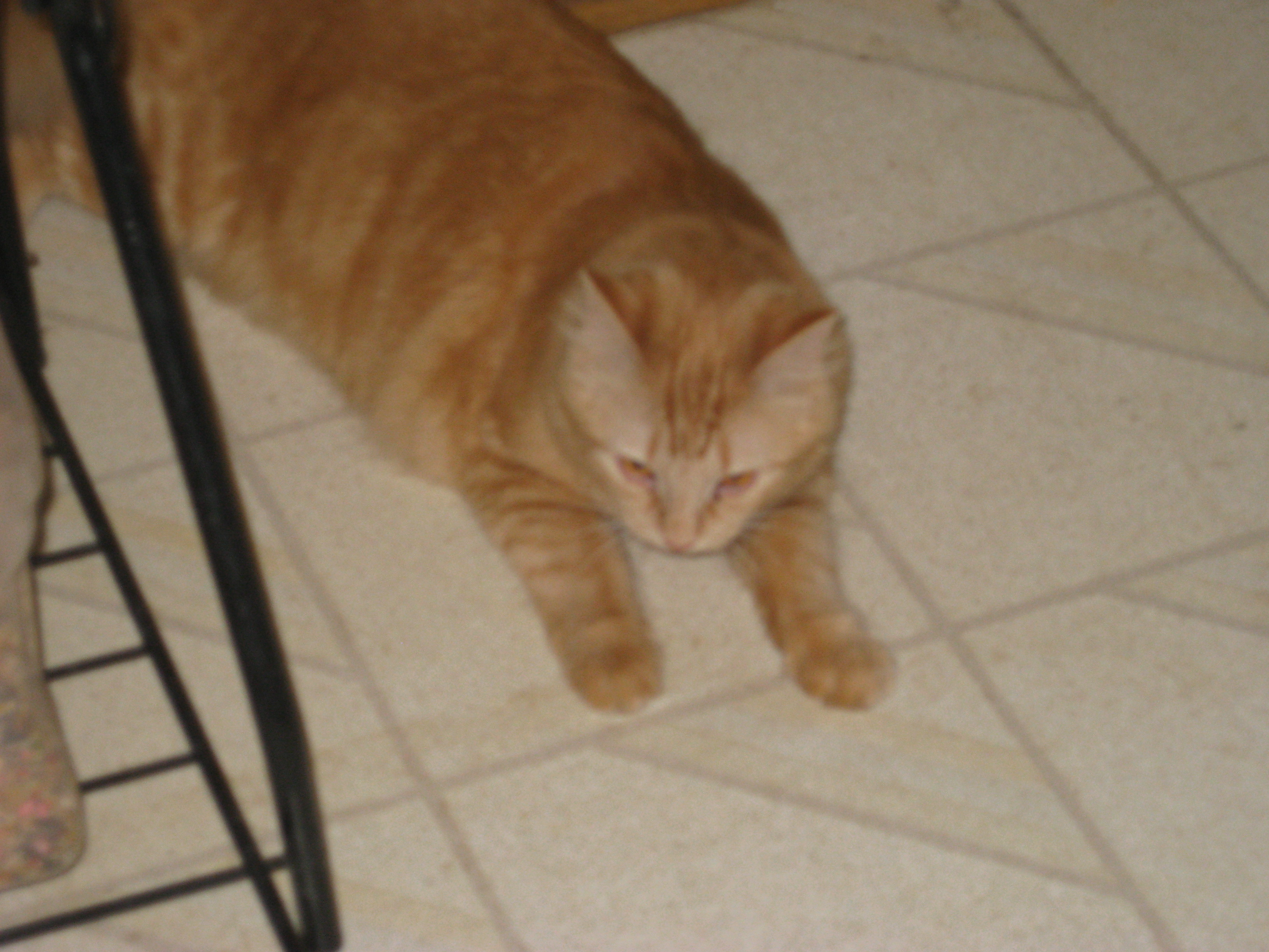 Jasmine is a little over a year hold. We call her "Sis Kitty" most of time. She has the most wonderful personailty. Because I bottle feed her initially, she loves getting on mine or daddy's chest and makea biscuits and pretends to nurse. She is love bug one minute and a she devil the next. She plays with balls and bread ties for hours on end. She loves to play and then will turn into an attack kitty. I wish I could have got a picture of her jumping from the dining room table to a mirror with a potted plant looking box, laying in it looking out just as happy as she could be. Of the thirteen in our house, she is the only orange kitty I have. She and the last rescue before her, TJ, also play endlessly in the house.