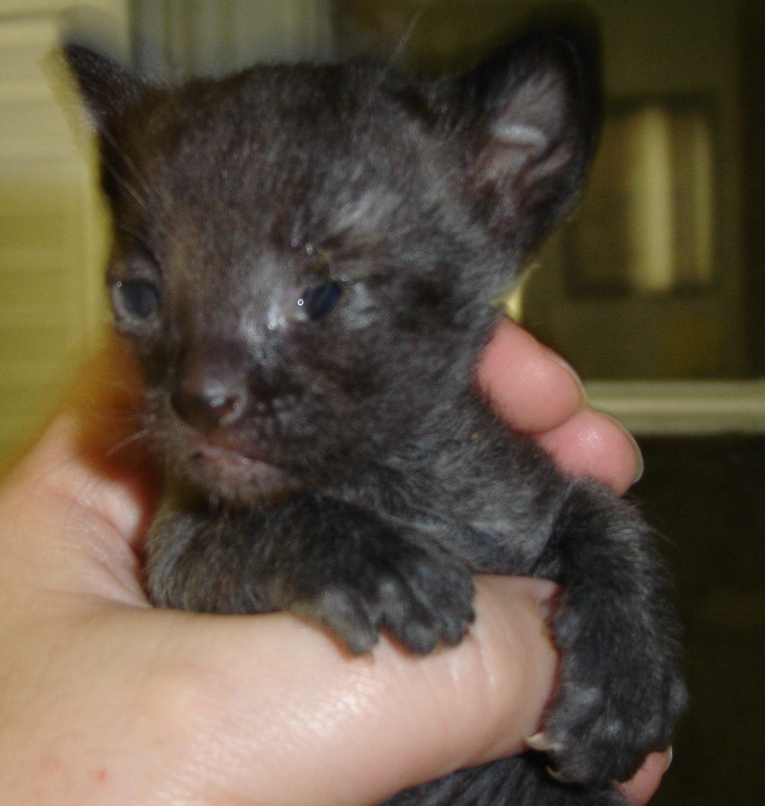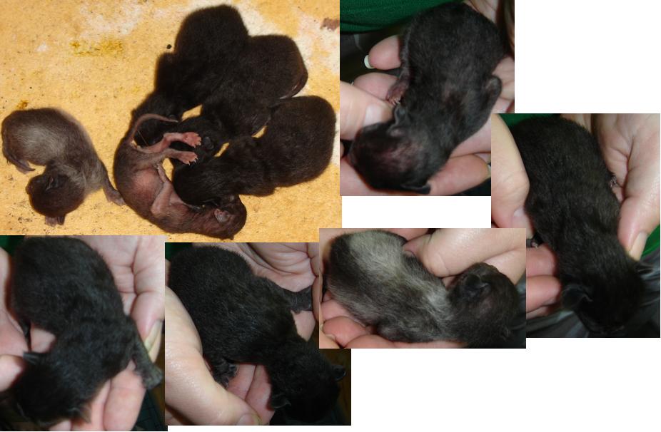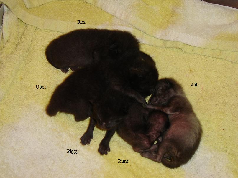 Around the time Job died, Pretty Mama developed mastitis She didn't want to nurse the babies, so we took over. They all took to the bottle quite well After about a week, Pretty Mama was ready to take back over We continued to supplement everybody with KMR, but they soon only wanted mama Runt finally started to grow some hair, and ALL of the babies started getting their teeth
