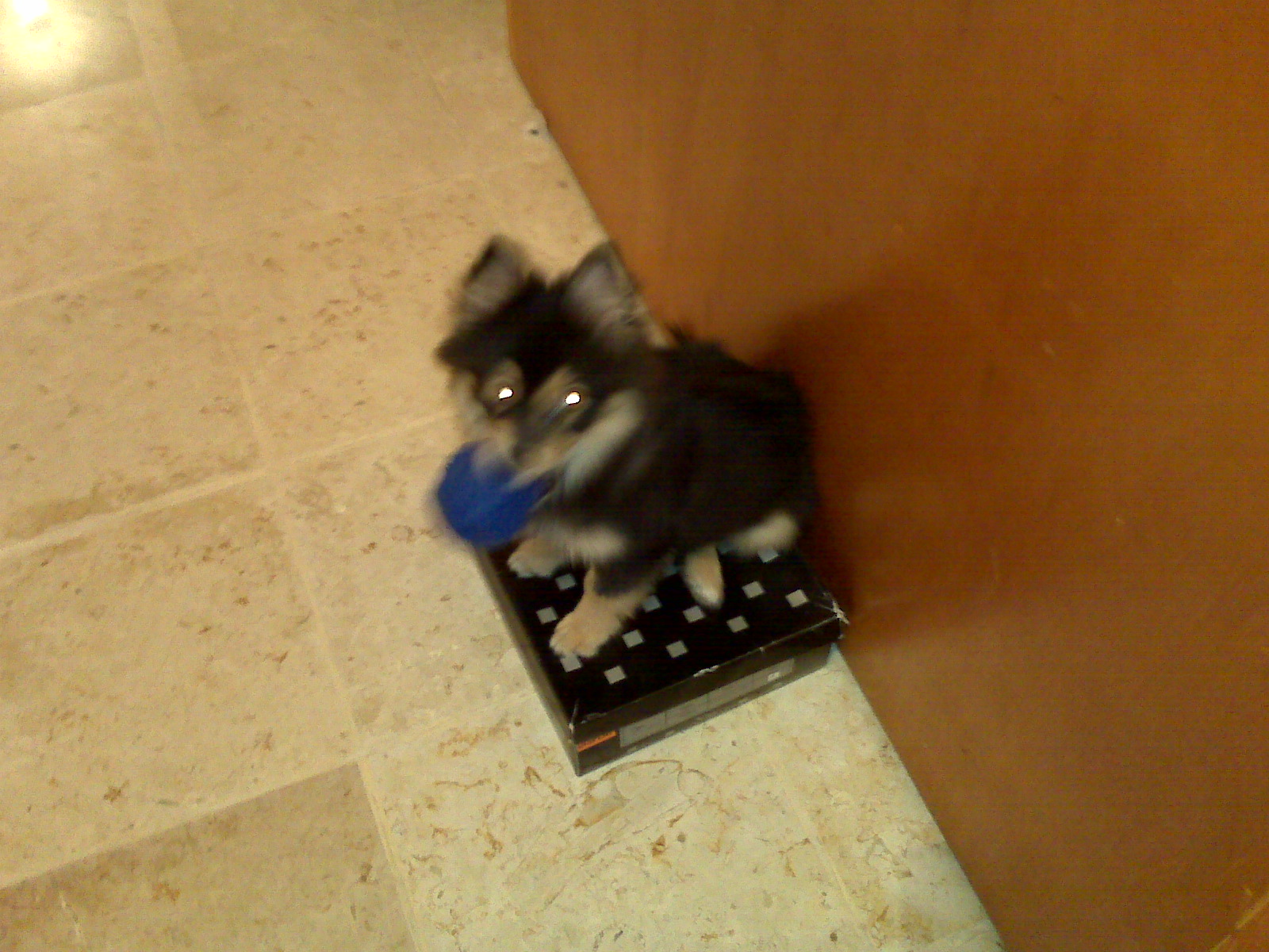 3.- he HAS to "climb" everything.. whereas it´s a towel, a mat, a suitcase, clothes, your feet, and even a shoebox!!.. he went there to chew on his toy..![]()