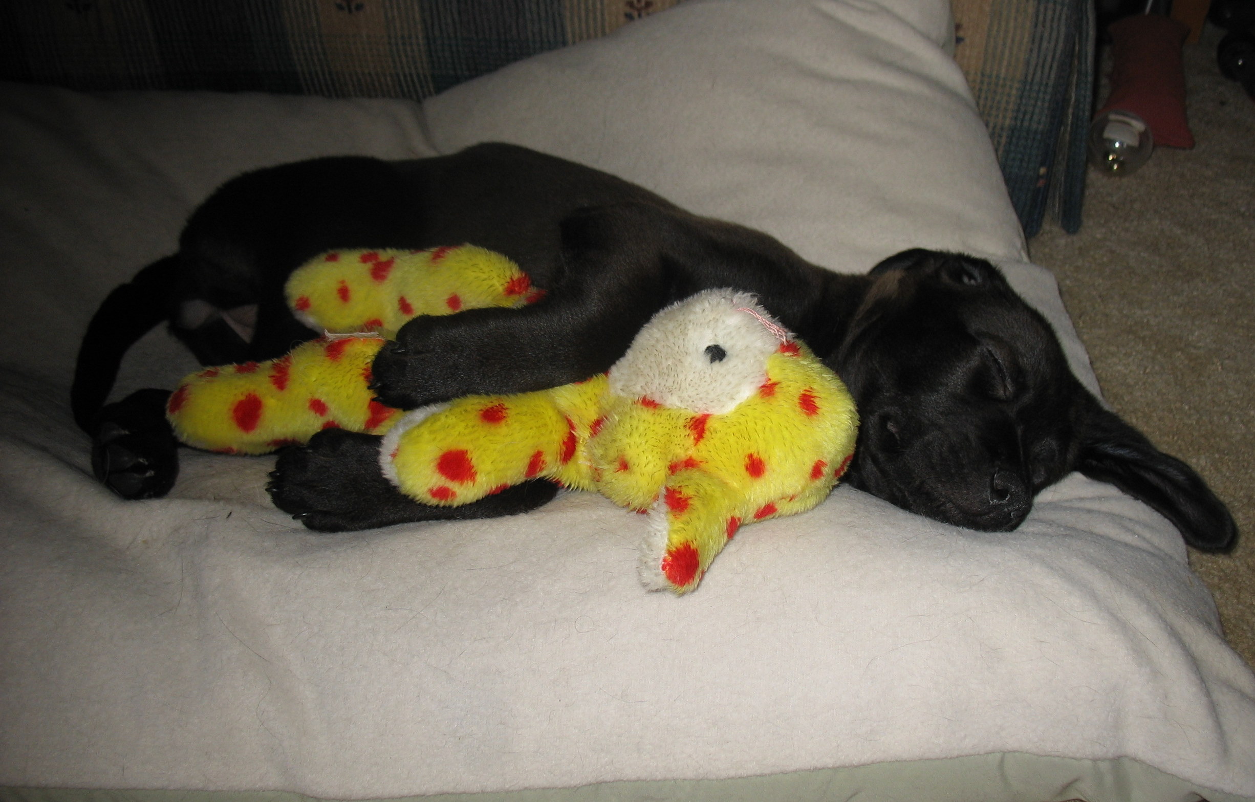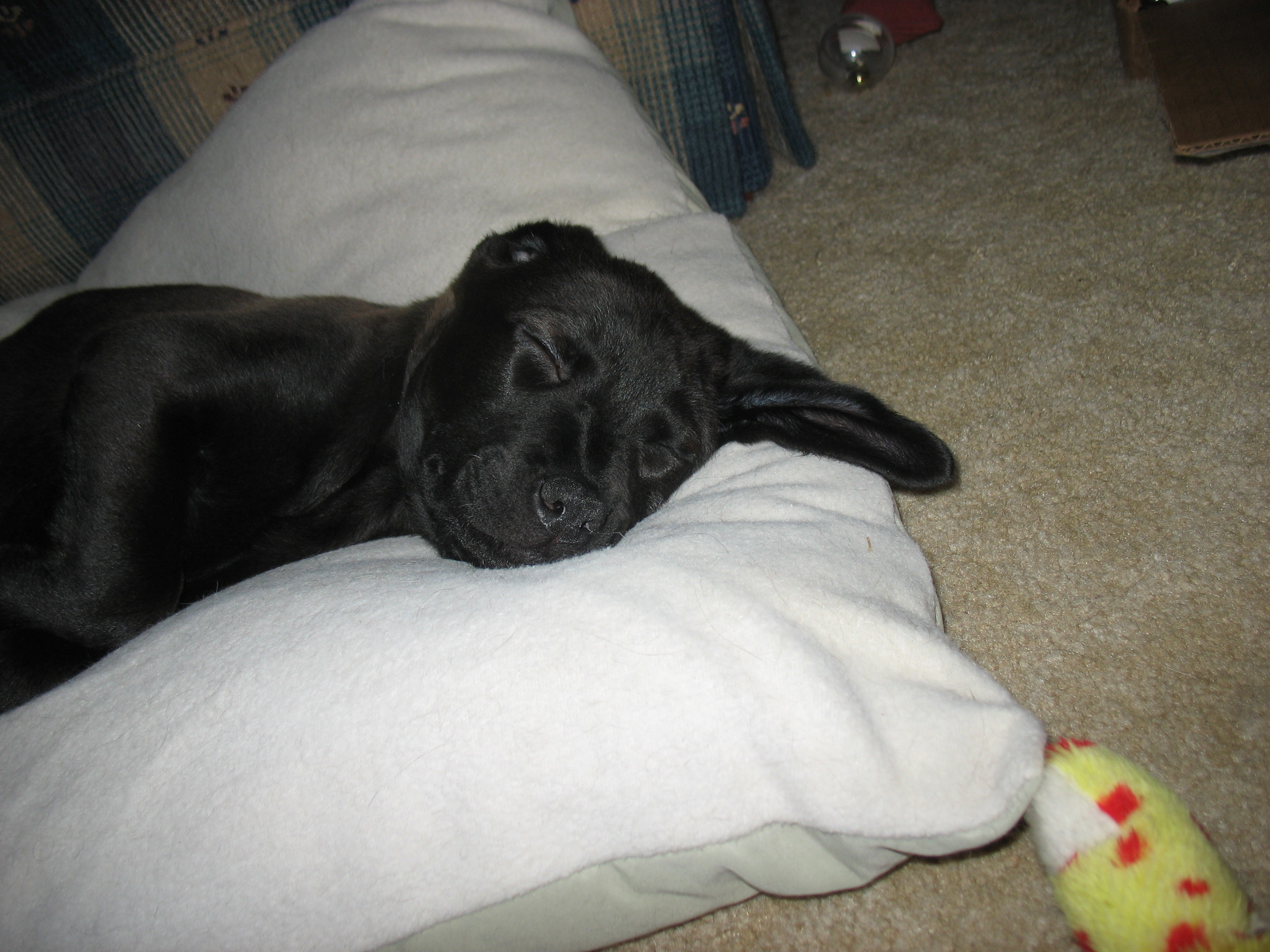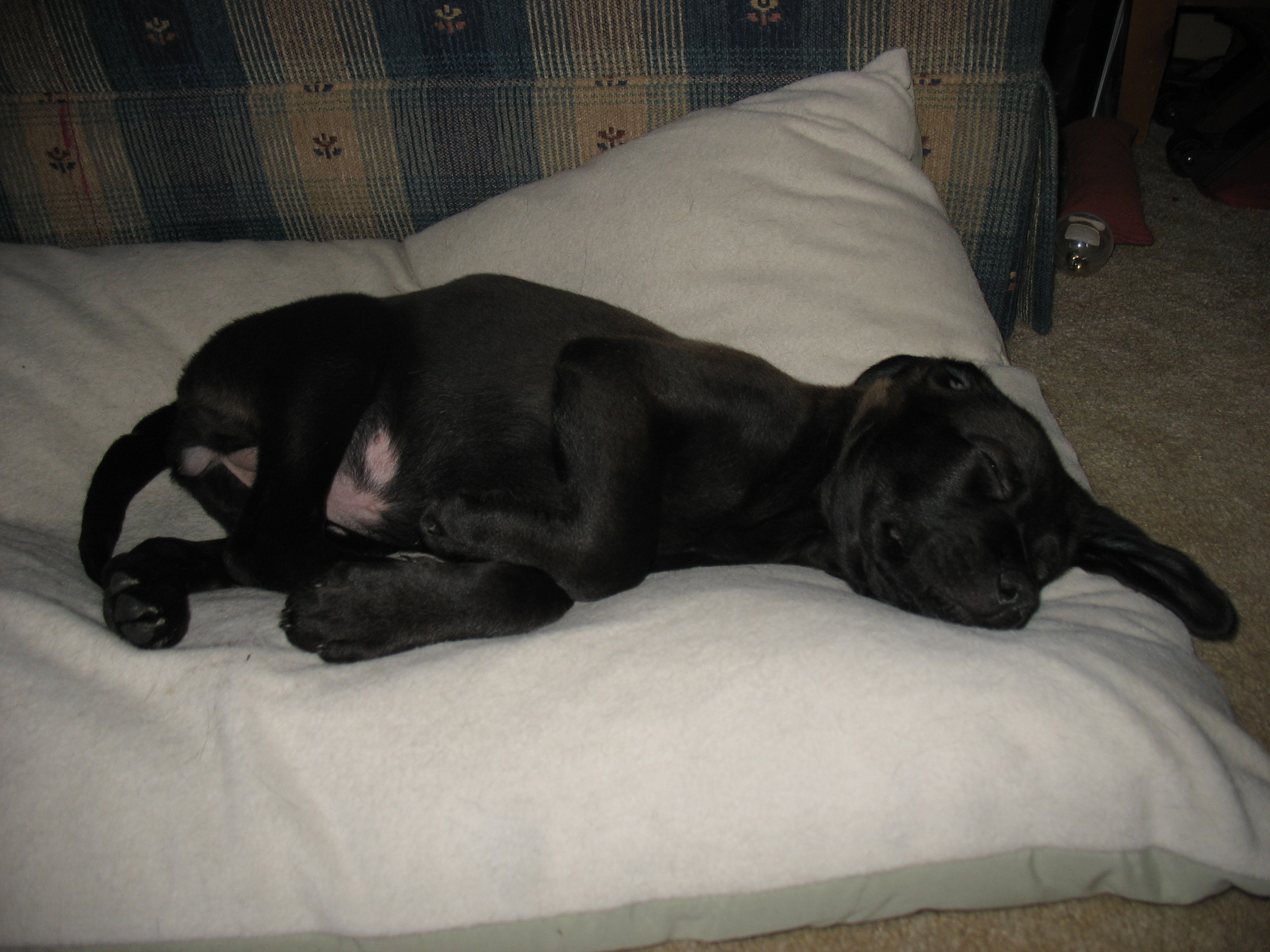 I got to meet the puppy today. My daughter brought her over for a visit. Cats have been really funny. The pup immediately wanted to play with Buddy, but Bud didn't reciprocate. He gave the pup a swat. The pup learned fast and is keeping her distance. Bud was hanging out under the end table in the living room while the pup played. Then the pup fell asleep on the cats' bed. All 3 of the cats have come in at various times and slowly walked up and sniffed the pup. She is really tired. Here are some pics.
