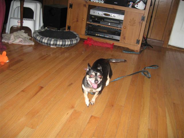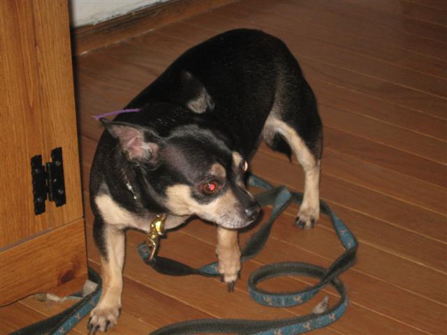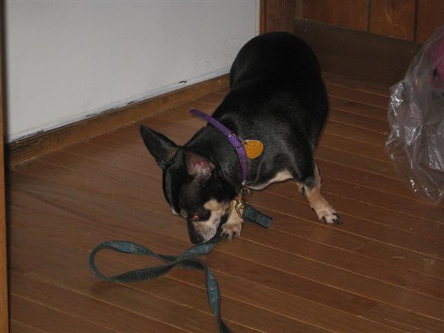 She has a rabies tag, and I have phoned the vet TWICE. They have called the owner and left a message on the answering machine. Not sure what is going on exactly, as she has been here since 10:30 AM, and even if they worked they should be home by now! The vet told me which city she lives in, it is across the river, a good 15 to 18 miles away. Looks like she is here for the night.