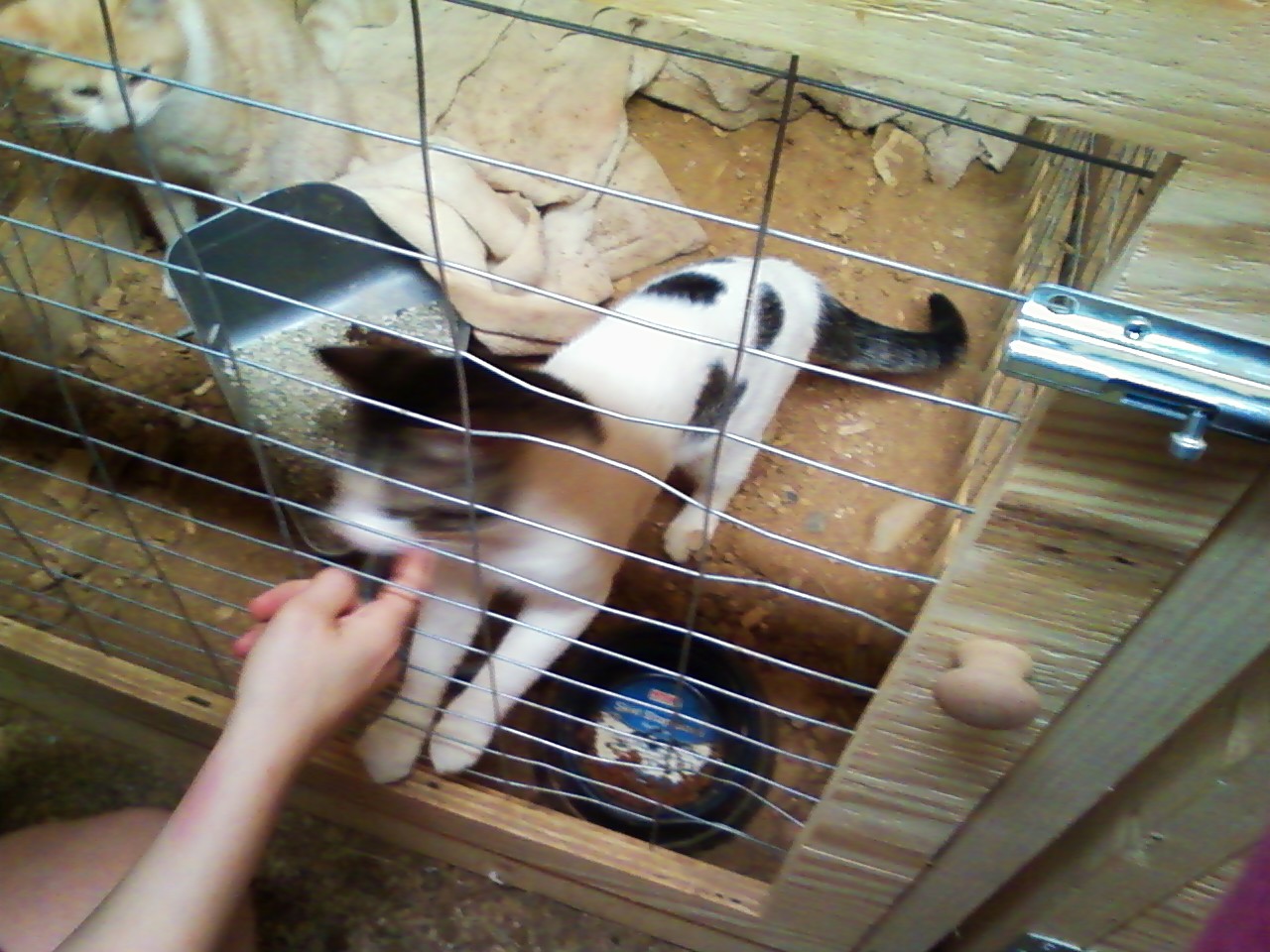 So she opened the second stall and there were cages, 3 or 4 big ones on the side that had 2 cats in one cage. A big dog cage that had 3 kittens in it. Along the left hand side there were about 5 cages, 3 seemed bigger than the first 2. So she said she would put them in the bigger one at the end. We put all 3 kittens in there and meanwhile I’m feeling uneasy about leaving them in this type of environment even though I’m sure cats love barns, etc. But I just felt terrible putting them in a cage like this. It has a wire bottom too.