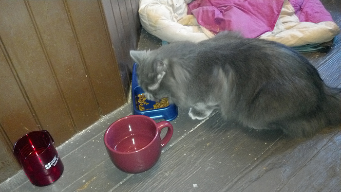 I found a cat who, once he saw me, retreated as far as he could from me and watched me as I inspected his food dishes. I went and got him a 16 oz ceramic mug of water and some of my own cat Nero’s food. Given that I knew the cat had been outside, I could not allow him into my apartment given that already had a cat whom I did not want to put at risk for any illnesses (not to mention the fact that my lease only allows for one animal).