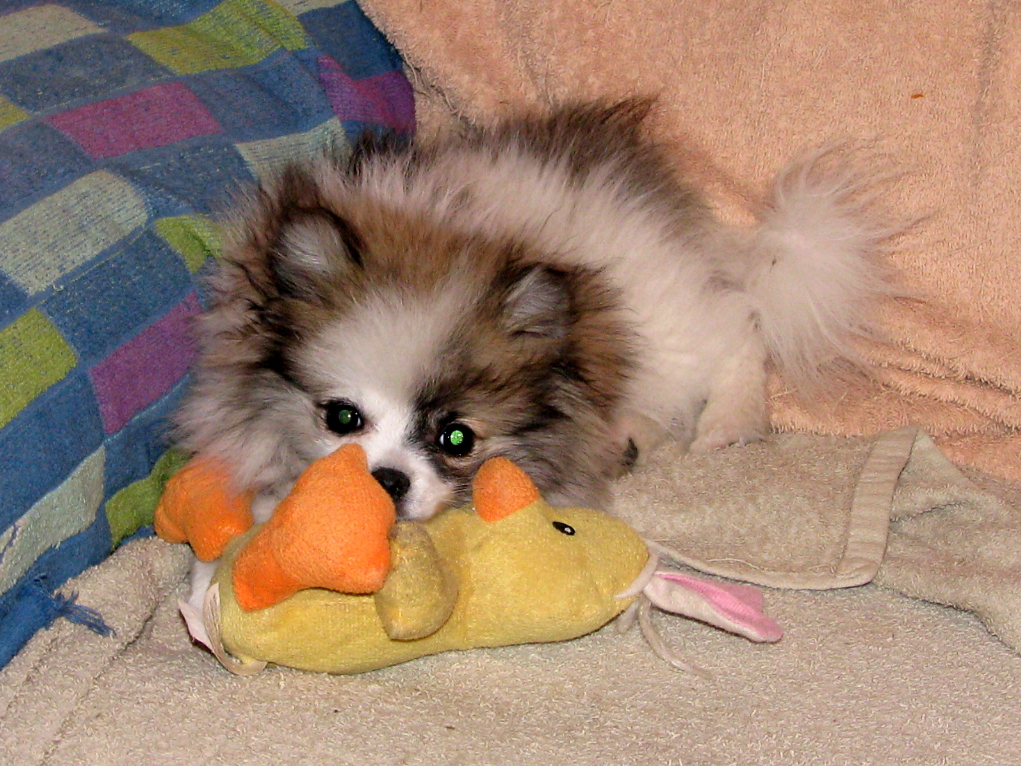 She wants to play with Luke cat and LilGirl and they dont like it. Yesteday Sissy and Luke cat got into a tussle with each other. I looked up when I heard cat sounds and puppy sounds and it looked as if they were attached in one big bundle...very scarey. I dont know who had who but I do know that in the past Sissy has pushed Luke into nearly fighting back because he gets tired of her "playing" with him. Sometimes I put one of them in a separate room or put Sissy in her crate for a time out. Anyway I yelled loudly and broke it up and would you believe that later Sissy still went after Luke to play??? Wonder how long this "puppy stage" will last? She's 3.5 months old (born 2.1.12).