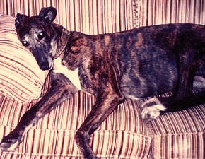 The first greyhound we ever owned, her name was Gracie. Her trainer from the track kept in close contact with us- Gracie would go CRAZY happy when she saw him at Greyhound events.