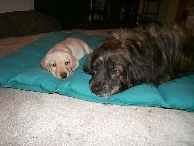 Love this site and thought I'd share their first day of meeting. All is going well, cept Brit objects to the tail pulling and ear nipping at times. (Don't blame her as the puppy has sharp little chompers like a piranha, lol).