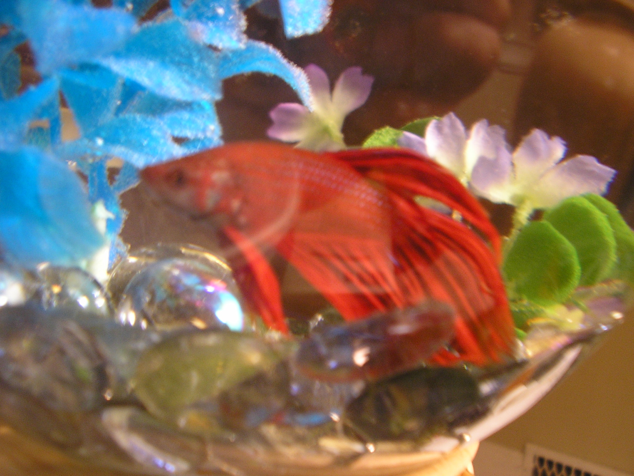 A red male betta.His name is Dexter, and he is a little WalMart rescue.