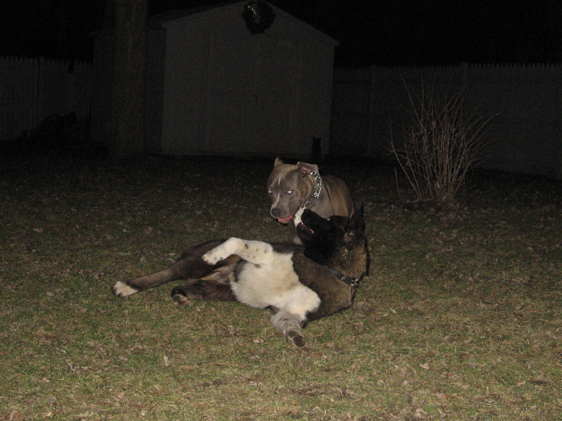 My friend Rob brought his 10 month old pitbull, Rex over to my house to play today with my 8 month old Akita, Zero.It was such a blast. At first they wrestled with each other for about an hour. We gave them lots and lots of water the whole time. Then I fed them both, separately. We tried to feed them together, but Zero snarled + growled so we separated them IMMEDIATELY. Rex was a little afraid of Zero for a few minutes after that, but then they were fine.