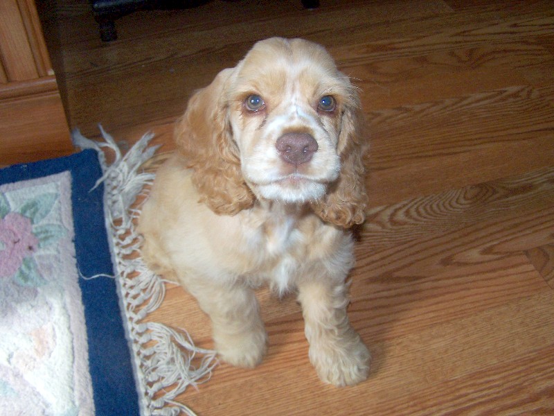 We picked Hunter up on tuesday, my new 10 week old cocker spaniel puppy!I love him to bits... he's buff with a white triangle on his noes and a streak of white going down his chest. I have never seen a dog give such enthusiastic kisses! He does so while lying on his back in your arms. He's.. bah! I just love him!