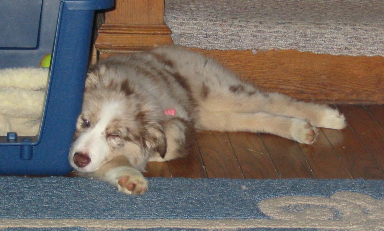 Zoey loves to lay underneith anything. We started her sleeping in a crate when she was little, so now I don't have the crate for her, she finds anything close enough.