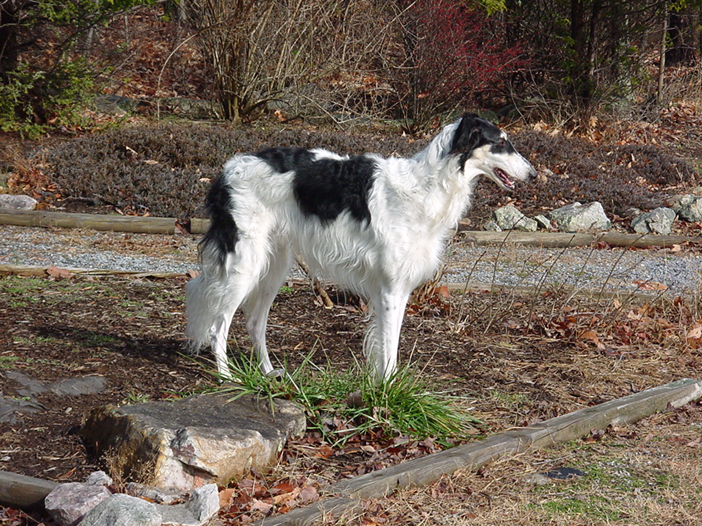 People have requested up to date pictures. My husband is holding the lead, and keep in mind- he is over 6 foot tall. Also some people are not sure which is which in the pictures I post. Galina has a wider skull, and spots of grey/mixed with black on her left shoulder- Zubin has a longer head and tighter back skull ( more desired). Galina is also obviously shorter in height. ( as she should be..) Also- here is a casual shot of Zubin in the yard watching his sister down below. You can see in the one shot of Zubin his beautiful shoulder and rear, and his rise on his back, like his sisters, is spot on right after the ribs as it should be.. Anyway- here we go.. They start the show ring in February, and I can not wait!