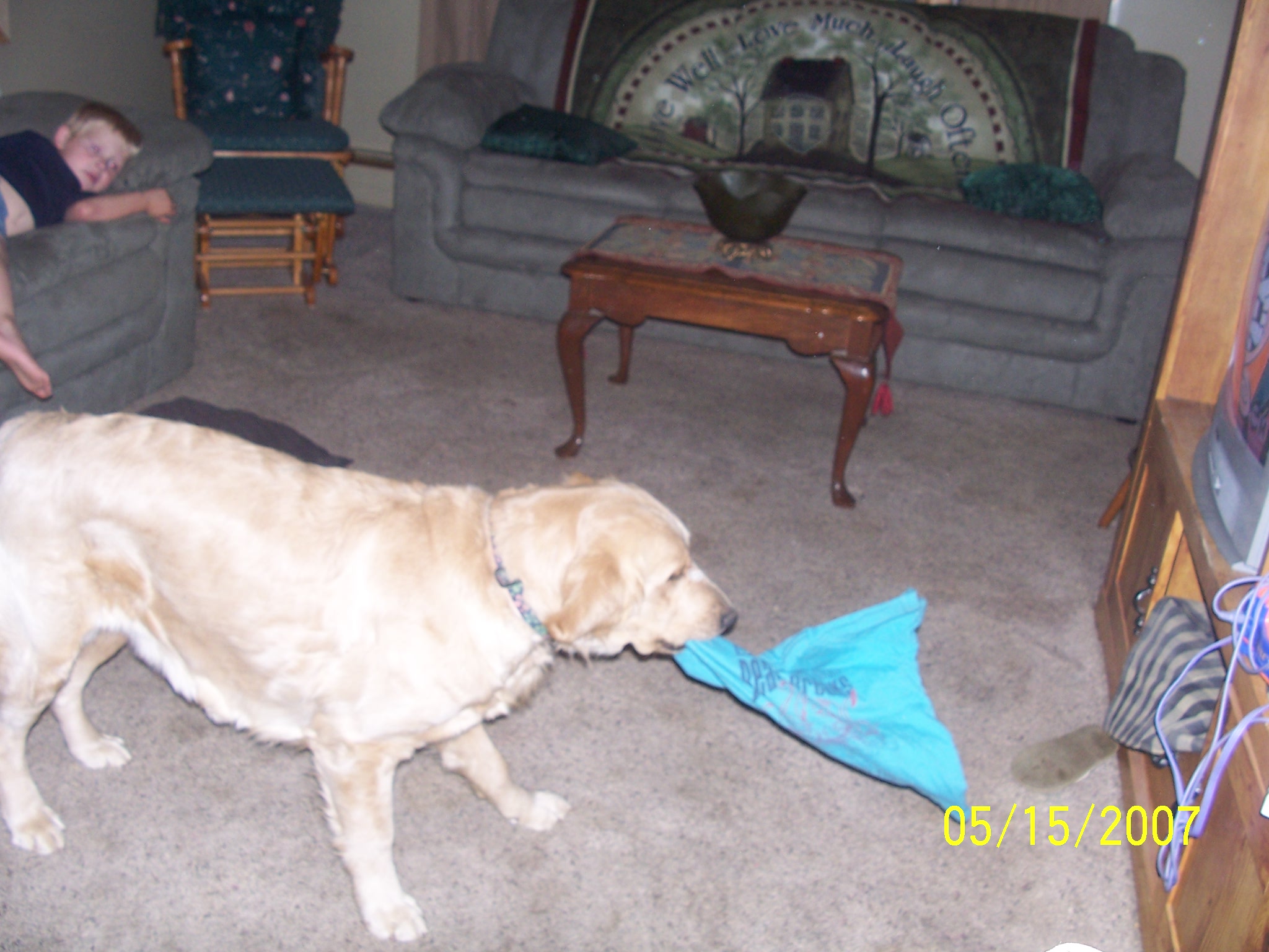 Dont you just love dogs? Today while I was outside feeding my rabbits Gracie my one golden retreiver broke into the kitchen got into one of the cabinets and stole orange JELLO!!! the packet was everywhere when I got back in the house and she stood there wagging her whole but with the left over box in her mouth!!! She ALWAYS has something in her mouth but her favorite is tennis balls and food but she will carry anything that fits in her mouth!!!