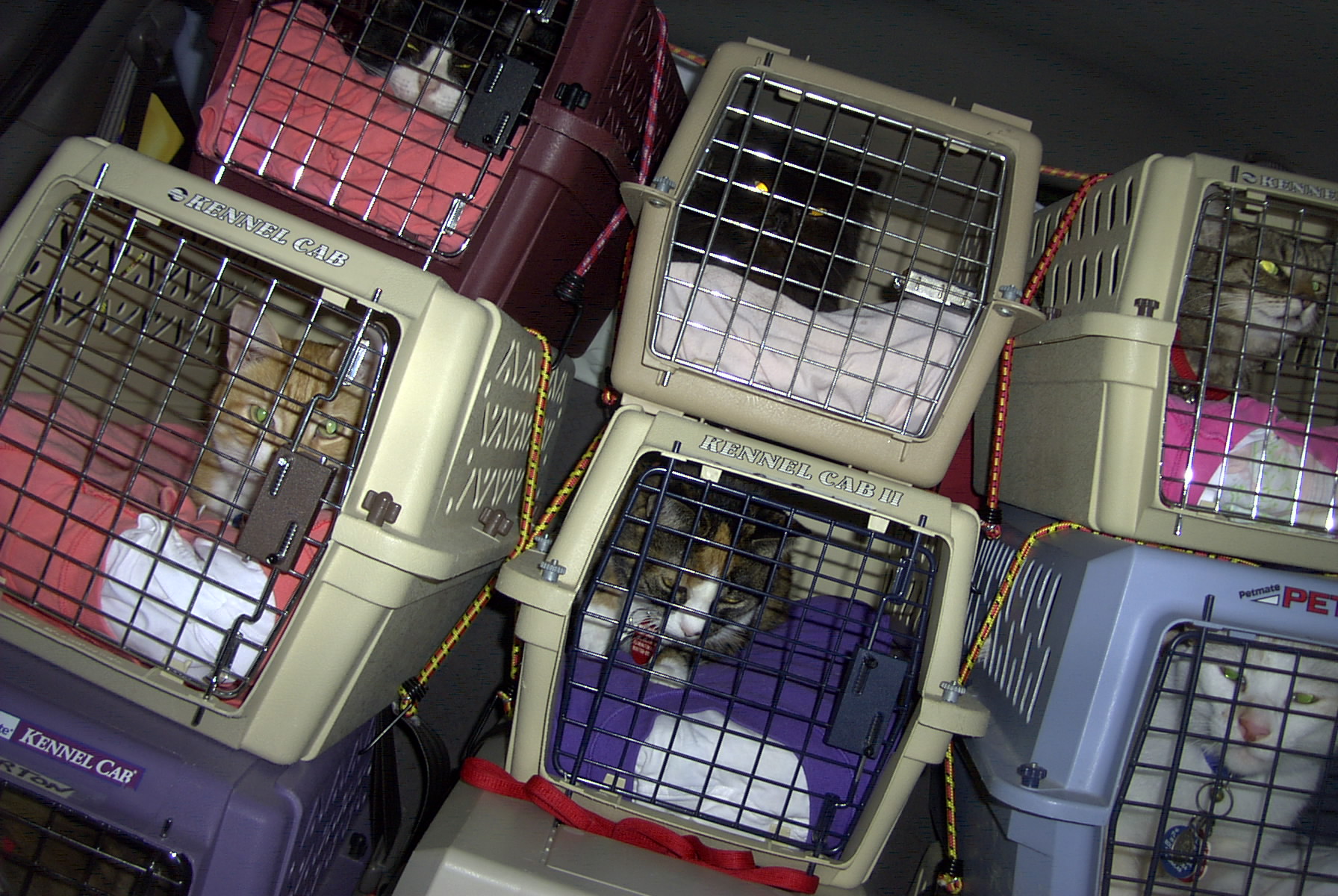 Into the cat carrier every few hours we offer them food and water and set up a litter box at each hotel/rest house.