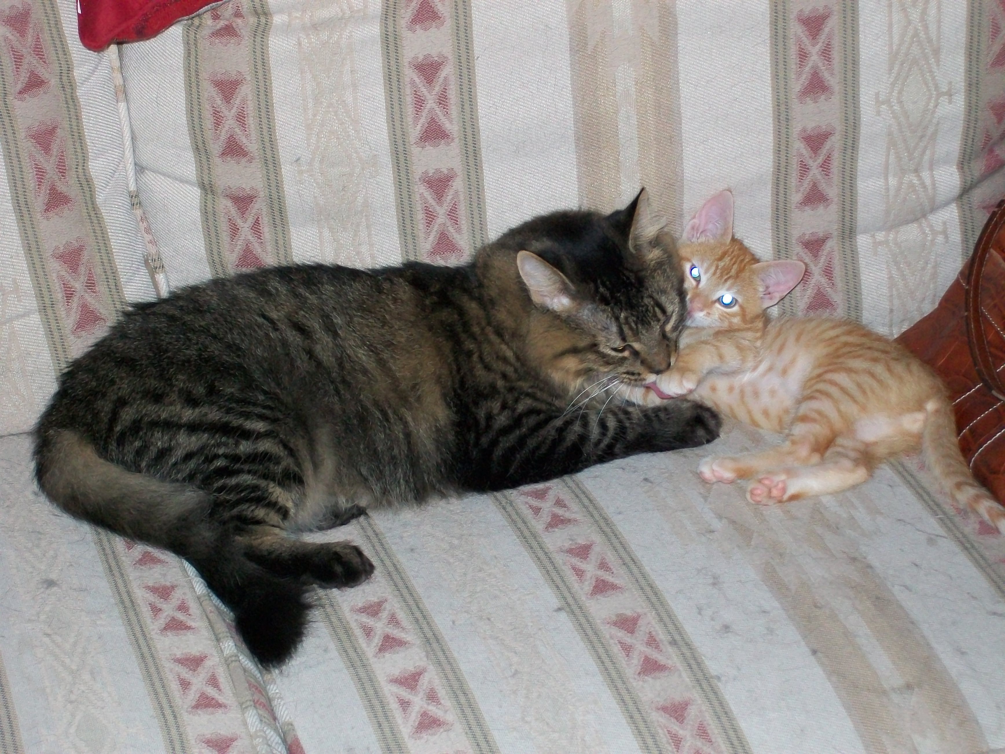 Aww, Ozzy sure loves the little orange kitten!