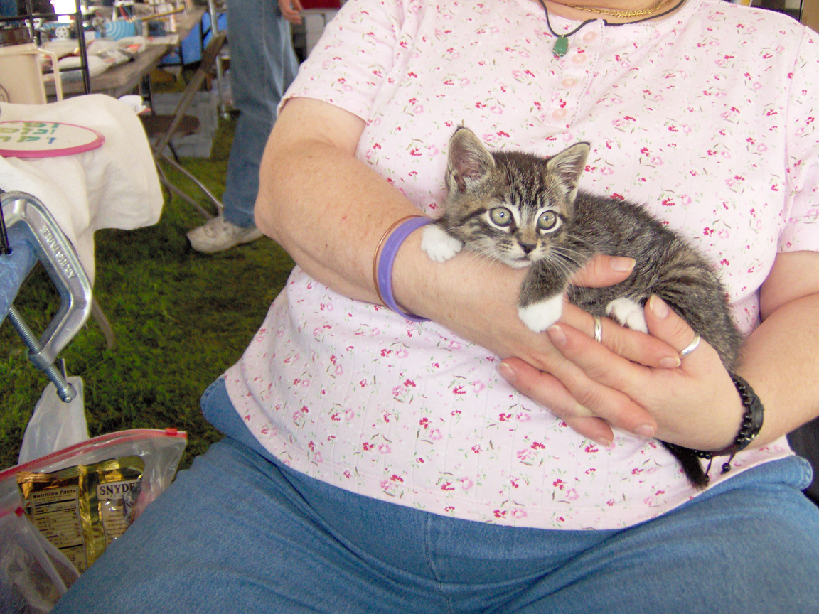 That night Roz spent the in a dresser draw after I ran to a store and got litter and cat food (don't give a kitten adult food, what gas) The next 3 days she was in a large box with a grid over it in the back of our show booth. But about half the time was on Lucy's lap in the booth. Everyone at the event fell in love with her.