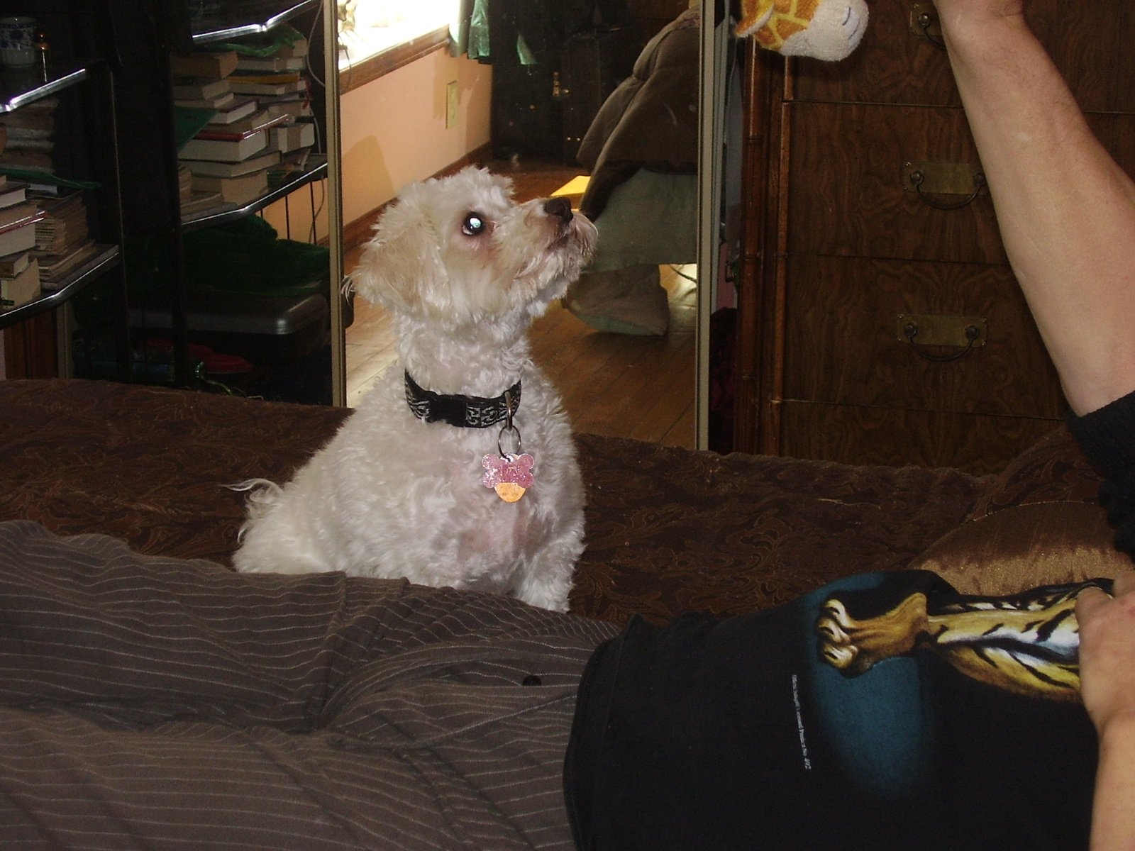 On Saturday John and I went to volunteer at an adoption event in a nearby town, helping to handle the dogs for adoption and sell doggy things from the stall. It was a big success and there were five shelters there showing dogs. The rescue we were supporting had a new dog looking for a foster home (they all live in foster homes as we dont have a kennel.) One new dog was slightly different as she is around fourteen years old and not perhaps likely to get adopted at her time of life. She is a very loving miniature poodle who was found trying to shelter under a truck in the Montreal midwinter and had a huge growth on her side which has been removed by the vet and luckily was benign. She took an instant liking to my husband ( for some reason most dogs do, lol) and spent most of the day curled up on his knee except for the occasional bathroom break! We have brought her home as a foster which will most likely be for the rest of her days. She is very friendly and apart from telling Ben his nose was cold when he sniffed a little too long , is getting along well with both our other pets! Napoleon has given her a few kisses and seems to accept her very well and Ben seems happy enough as long as he still gets his fair share of cuddles and treats, lol. He is still king of the big bed as she is too small and old to climb up on it and has a cosy comfy dogbed of her own which she prefers anyway. As she is a little incontinent I am pleased about that... easier to clean up the mistakes .