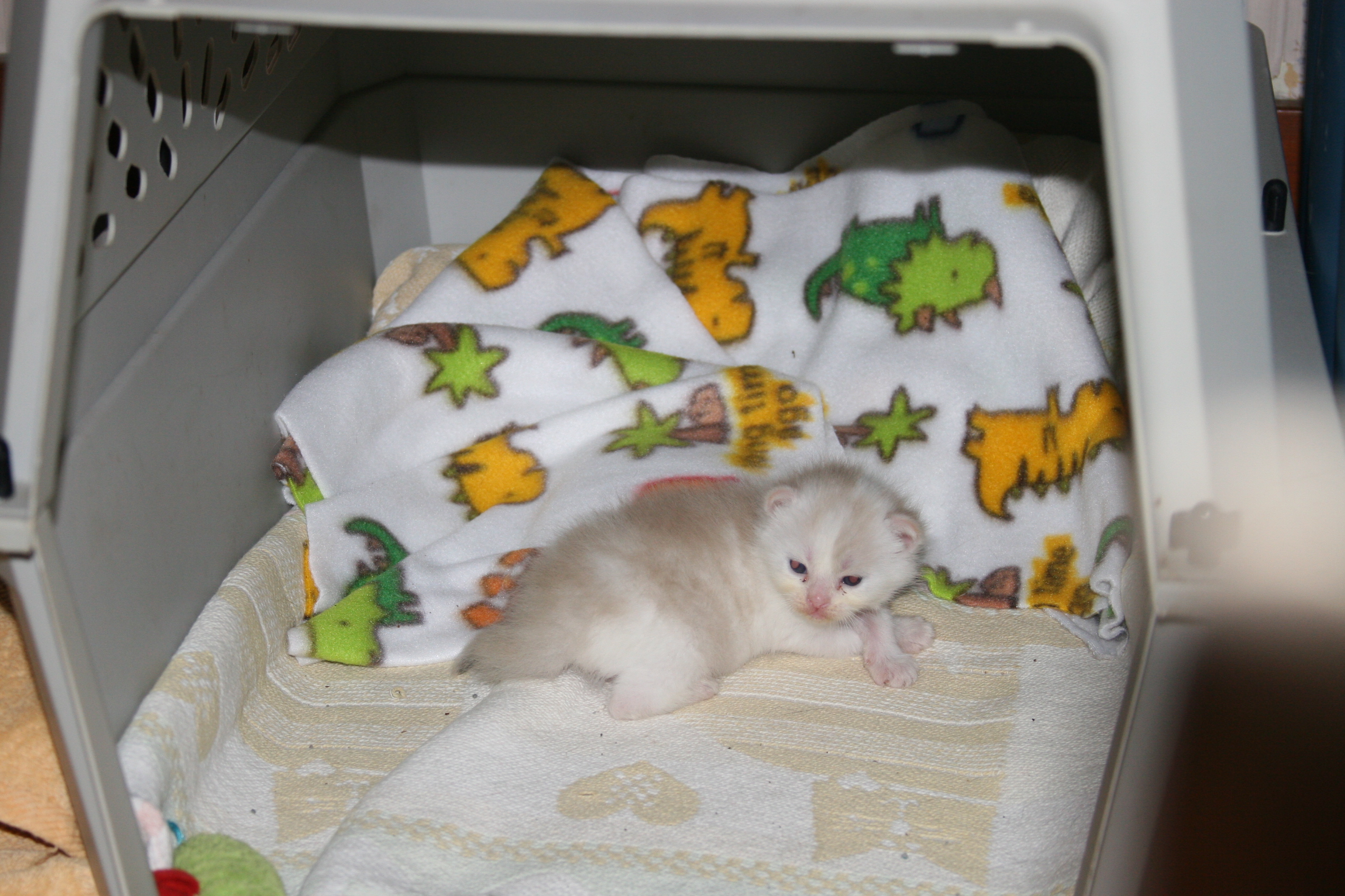 There has been a small white and multi-color cat hanging around the back yard for a few months now. And it became quite obvious a while ago that she was going to be a momma…best guess is that she delivered sometime around the fourth of July…in the neighbor’s garage. We had decided that we were going to talk to the neighbor, ask them not to disturb them (if possible) for a little bit and we would get them out of the garage and deal with them. Usually momma would come to eat and then rush right back to the garage to her little ones. Last Sunday she was hanging around, didn’t seem inclined to go anywhere but also wouldn’t really settle down in one spot. I walked up to the garage with our neighbor Tim and we looked thru the windows, saw no sign of kittens…when the woman who lives there came home we went up to talk to her. Her daughter, about 10 years old or so, answers the door with a tiny little furball in her hands. Evidently momma was moving them and they thought she had left one behind and took in and were bottle feeding it. I asked if I could reunite it with its momma and she handed him right over. Momma and baby were both thrilled to be reunited. She settled down and let him feed a bit…then she picked him up and off she went…with 5 of us following. She started out heading towards an empty house across the street. Not a bad place, there was room under the porch so I was thinking ok, not a bad place for the kittens…but NO!!! she comes back off of the curb and down a storm drain…really? Sigh…ok so we look in and there she is with the kitten all settled in. Forward to yesterday….we got home last night and Tim is fashioning a sling type of thing out of a pillow case and string. His plan was to lower it in to the drain, nudge the little guy onto it, pull it up, and then hopefully momma would come out on her own…we change clothes and go to help out, taking a carrier with us. Come to discover that she can’t (or won’t) come out of there. We are waiting for another neighbor to appear with his implements of destruction (pry bar and pick ax) and then we are going in…well Tim gets tired of waiting, grabs the grate and lifts it right out of there! Fortunately the drain is only about 2 feet deep, and the bottom is covered in dirt and weeds. So no worries about stray snakes/alligators etc that used to be family pets and got dumped in there or anything….Mike goes in. The problem is that there is a bar across the middle preventing free movement. He gets in there but can’t turn/bend to get to them. He comes out and in I go…I ended up straddling the bar and even then it was quite the twist to get them. Handed the kitten out and then reached for momma. She didn’t fuss or anything. I figure if she hadn’t been out of there since Sunday she was probably too weak to really put up a fight…got them both into the carrier and they are now safely tucked away in our spare room.